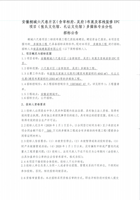 安徽桐城六尺巷片区(含宰相府、吴府)布展及客栈装修EPC项目(张氏文化馆、礼让文化馆)多媒体招标公告