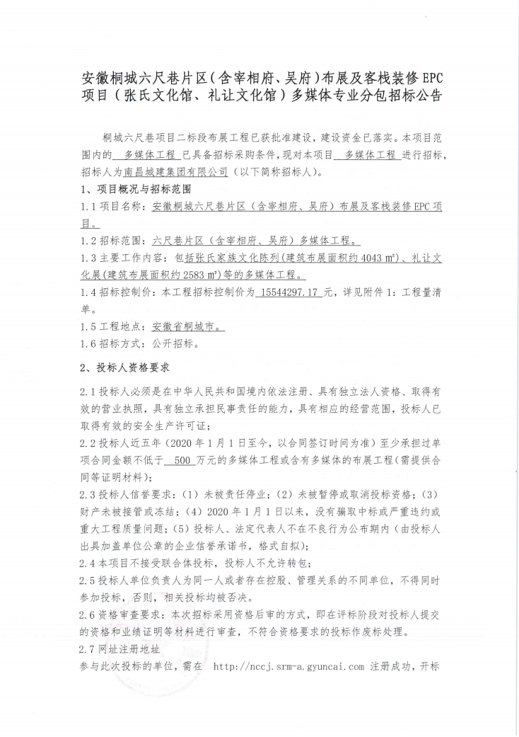 安徽桐城六尺巷片区(含宰相府、吴府)布展及客栈装修EPC项目(张氏文化馆、礼让文化馆)多媒体招标公告