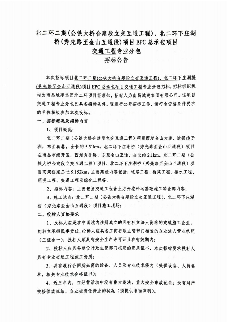 北二环二期、北二环下庄湖桥项目EPC总承包项目交通工程专业分包招标公告