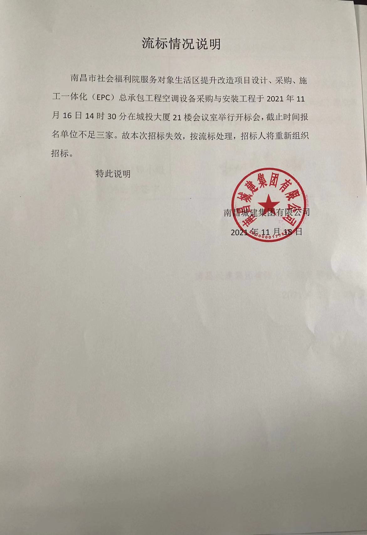 南昌市社会福利院服务对象生活区提升改造项目设计、采购、施工一体化(EPC)总承包工程空调设备采购与安装工程于2021年11月16日14时30分在城投大厦21楼会议室举行开标会,截止时间报名单位不足三家。故本次招标失效,按流标处理,招标人将重新组织招标。