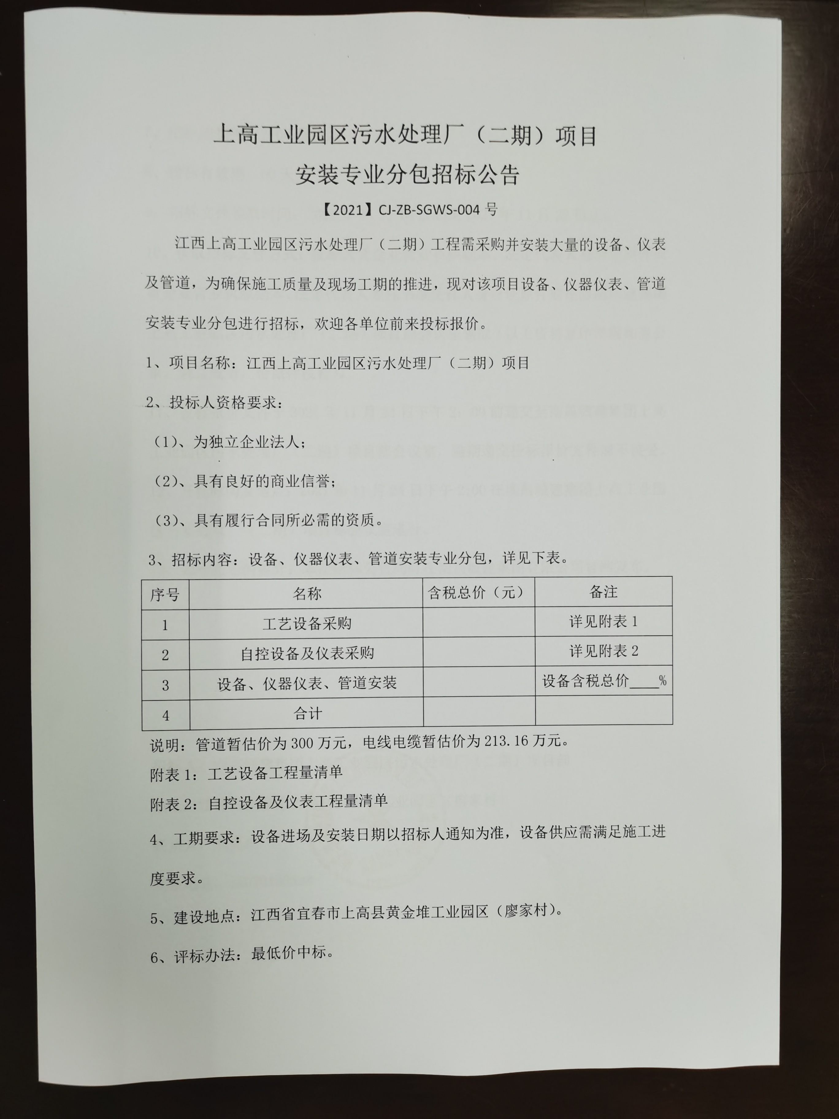 江西上高工业园区污水处理厂(二期)工程需采购并安装大量的设备、仪表及管道,为确保施工质量及现场工期的推进,现对该项目设备、仪器仪表、管道安装专业分包进行招标,欢迎各单位前来投标报价。