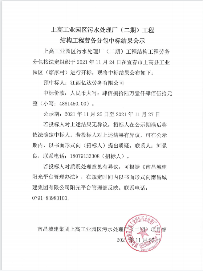上高工业园区污水处理厂(二期)工程结构工程劳务分包按法定组织于2021年11月24日在宜春市上高县上高工业园区(廖家村)进行开标,现将中标结果公布如下: