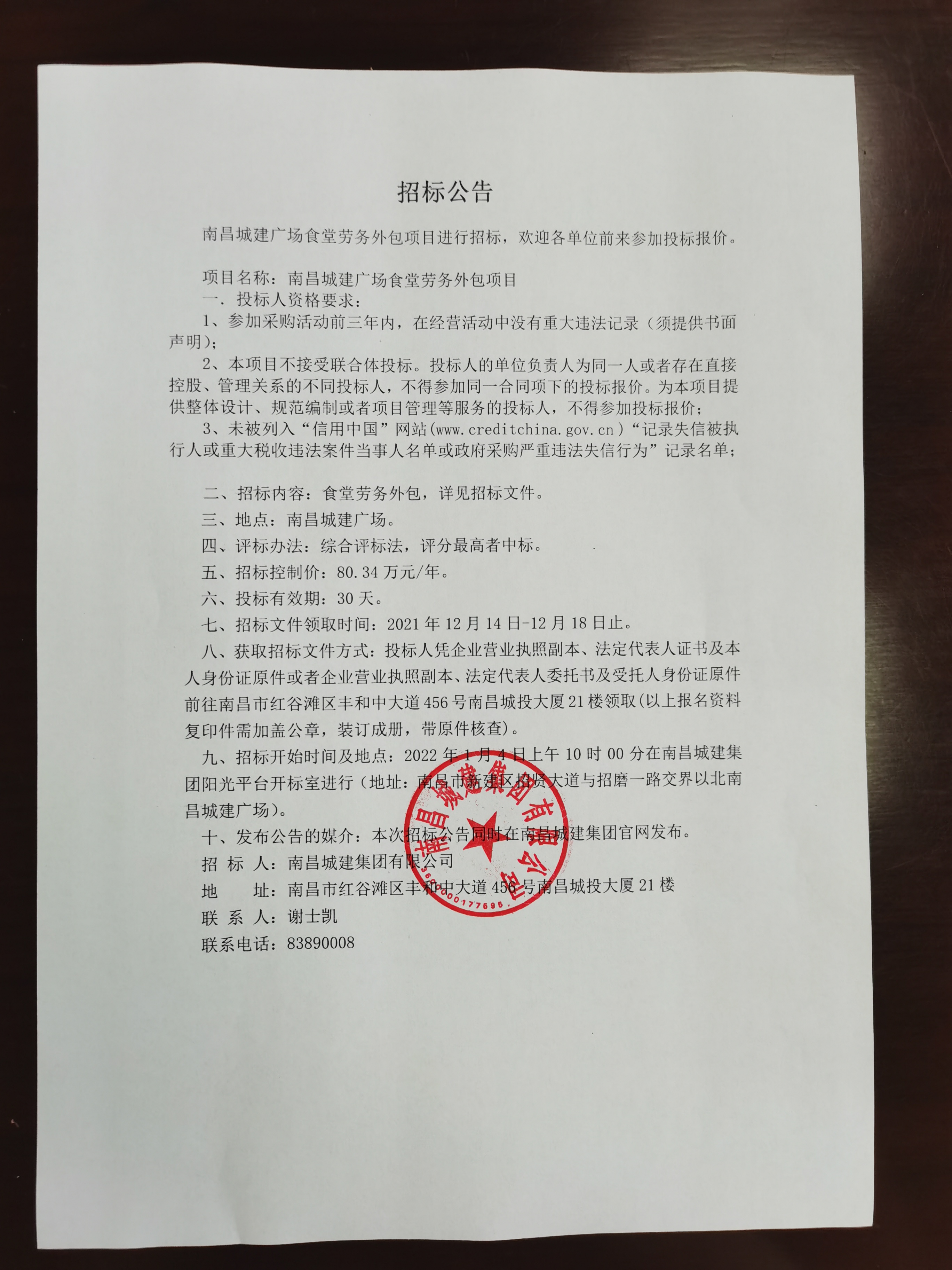 二、招标内容:食堂劳务外包,详见招标文件。