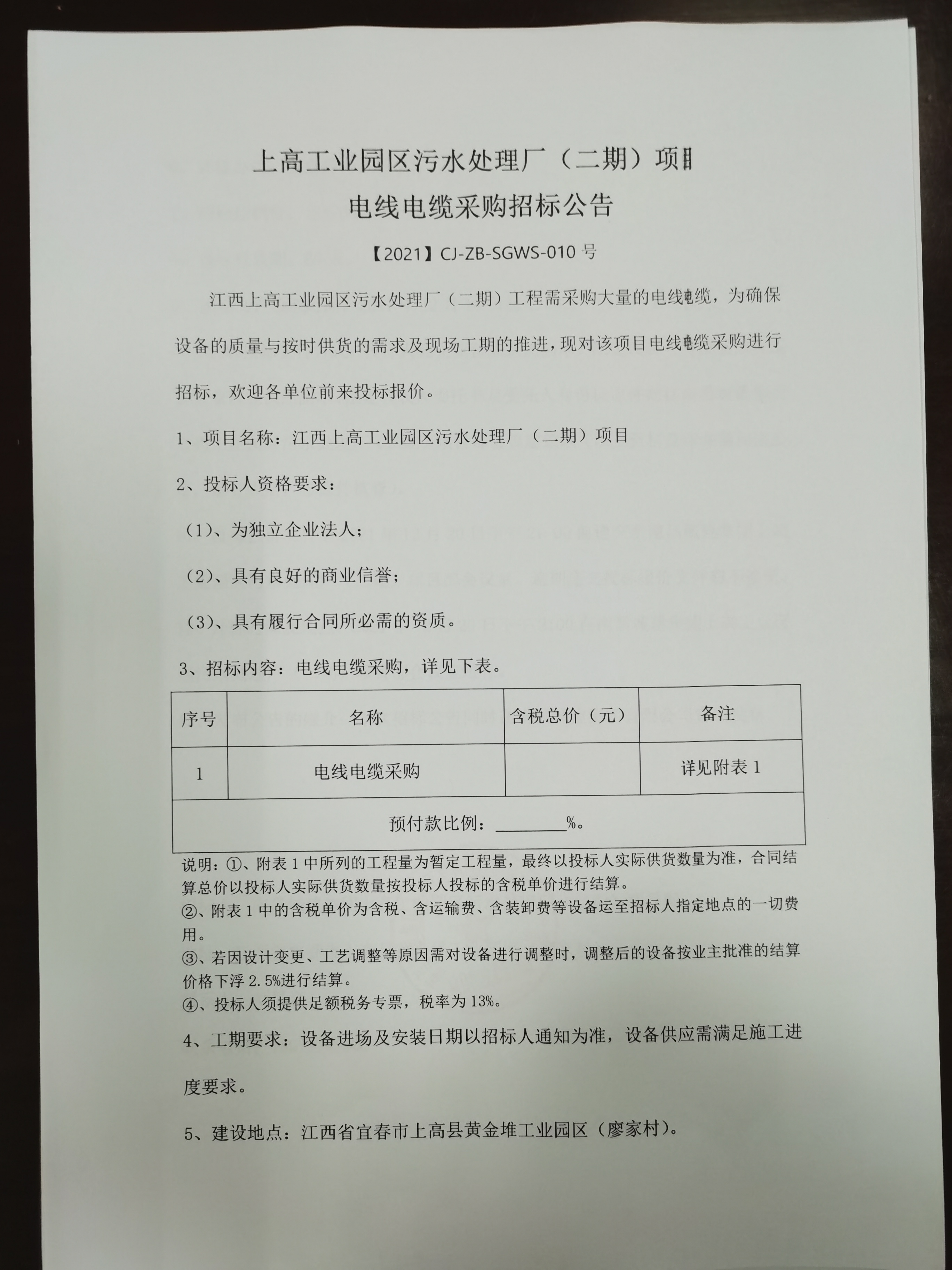 江西上高工业园区污水处理厂(二期)工程需采购大量的电线电缆,为确保设备的质量与按时供货的需求及现场工期的推进,现对该项目电线电缆采购进行招标,欢迎各单位前来投标报价。