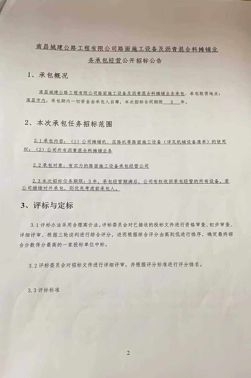威廉体育公路工程有限公司路面施工设备及沥青混合料摊铺业务承包,承包租赁地点:南昌市内,承包期内一切资金由承包人自筹,本次招标合同期限 3 年。