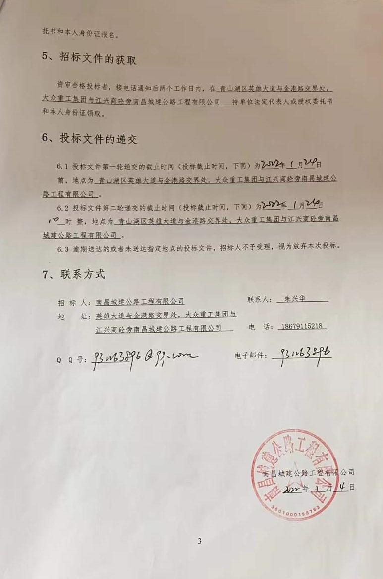 资审合格投标者,接电话通知后两个工作日内,在 青山湖区英雄大道与金港路交界处,大众重工集团与江兴商砼旁威廉体育公路工程有限公司 持单位法定代表人或授权委托书和本人身份证领取。