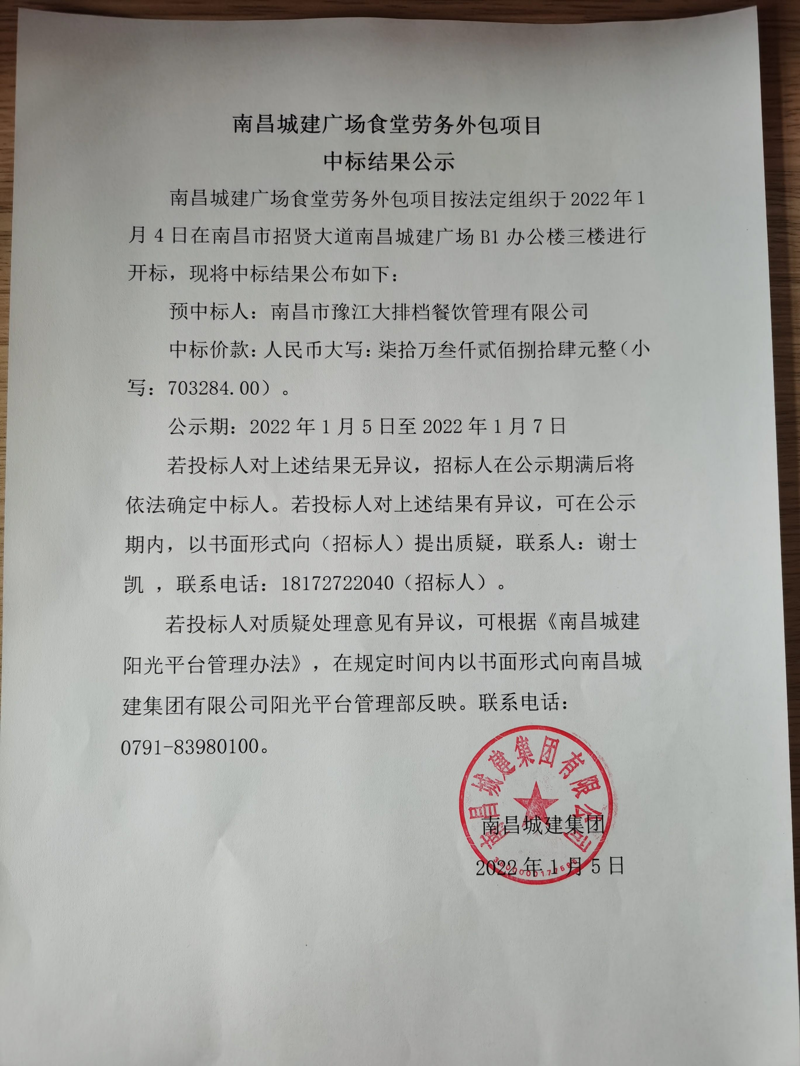 威廉体育广场食堂劳务外包项目按法定组织于2022年1月4日在南昌市招贤大道威廉体育广场B1办公楼三楼进行开标,现将中标结果公布如下:
