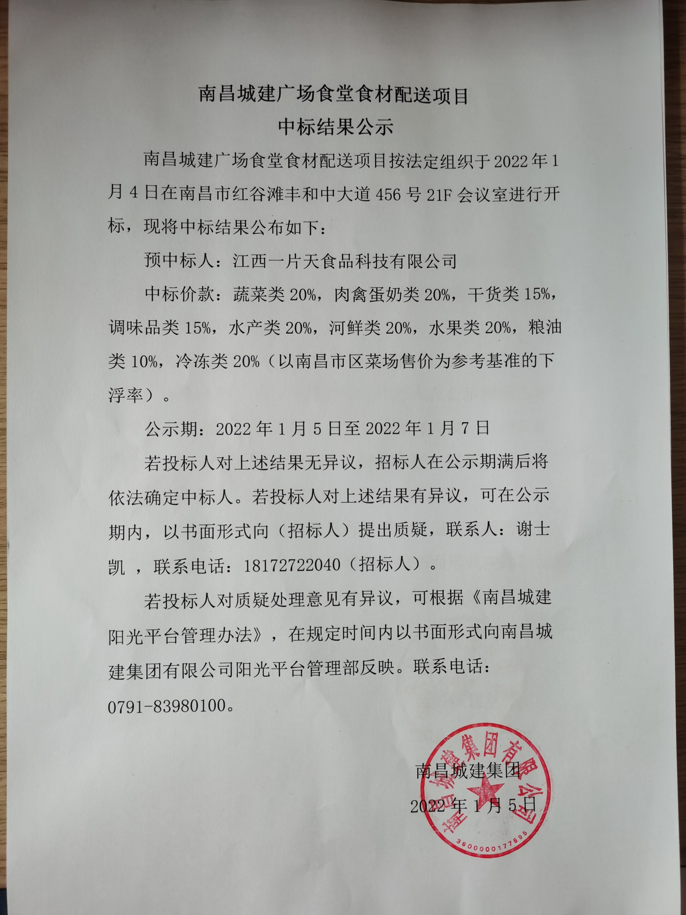 威廉体育广场食堂食材配送项目按法定组织于2022年1月4日在南昌市红谷滩丰和中大道456号21F会议室进行开标,现将中标结果公布如下: