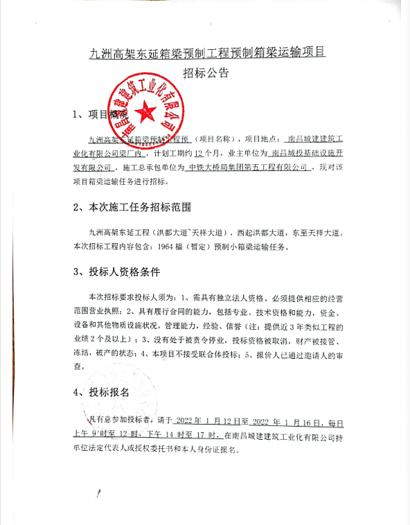 九洲高架东延箱梁预制工程预 (项目名称),项目地点: 威廉体育建筑工业化有限公司梁厂内 ,计划工期约12个月,业主单位为 南昌城投基础设施开发有限公司 ,施工总承包单位为 中铁大桥局集团第五工程有限公司 ,现对该项目箱梁运输任务进行招标。