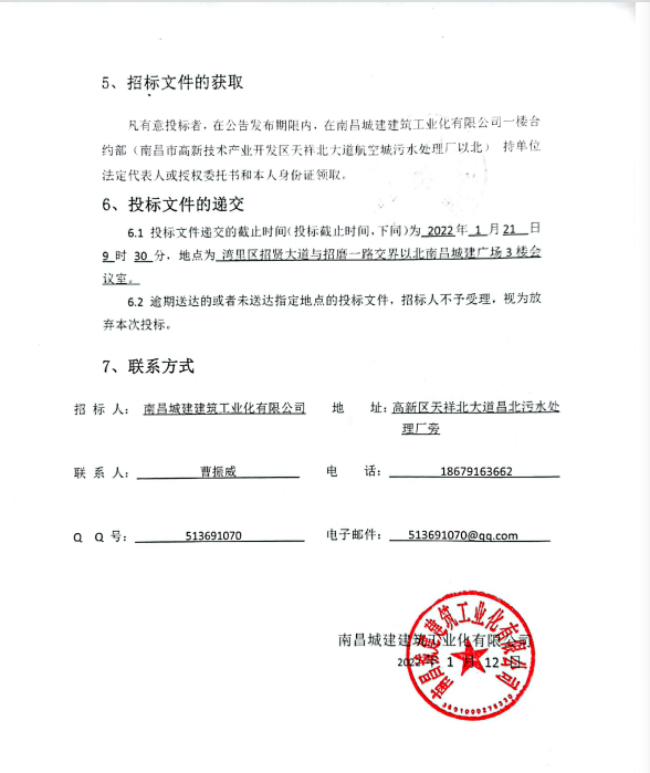 6.1 投标文件递交的截止时间(投标截止时间,下同)为 2022年 1 月21 日 9 时 30 分,地点为 湾里区招贤大道与招磨一路交界以北威廉体育广场3楼会议室。