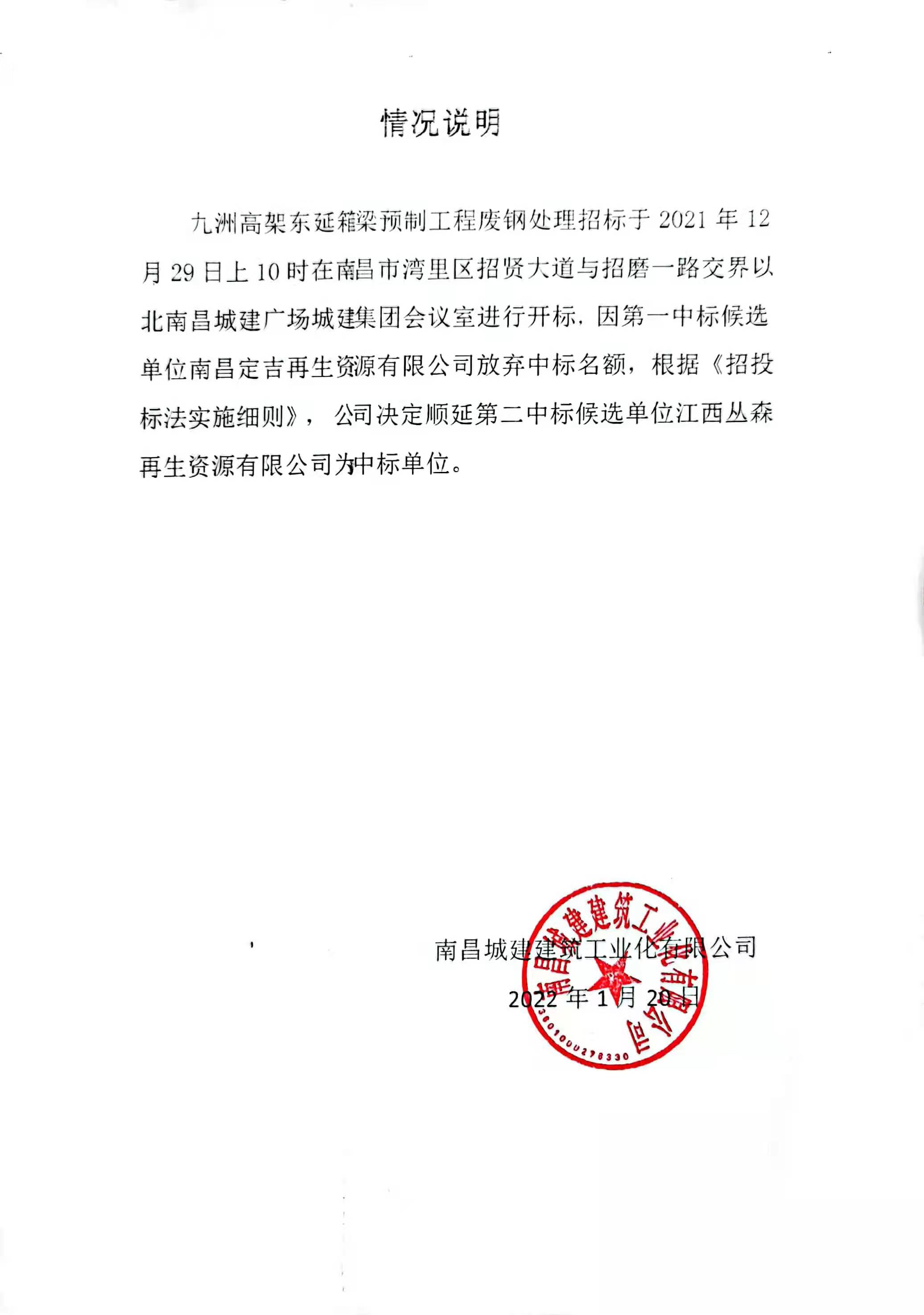 九洲高架东延箱梁预制工程废钢处理招标于2021年12月29日上午10时在南昌市湾里区招贤大道与招磨一路交界以北威廉体育广场城建集团会议室进行开标,因第一中标候选单位南昌定吉再生资源有限公司放弃中标名额,根据《招投标法实施细则》, 公司决定顺延第二中标候选单位江西丛森再生资源有限公司为中标单位。