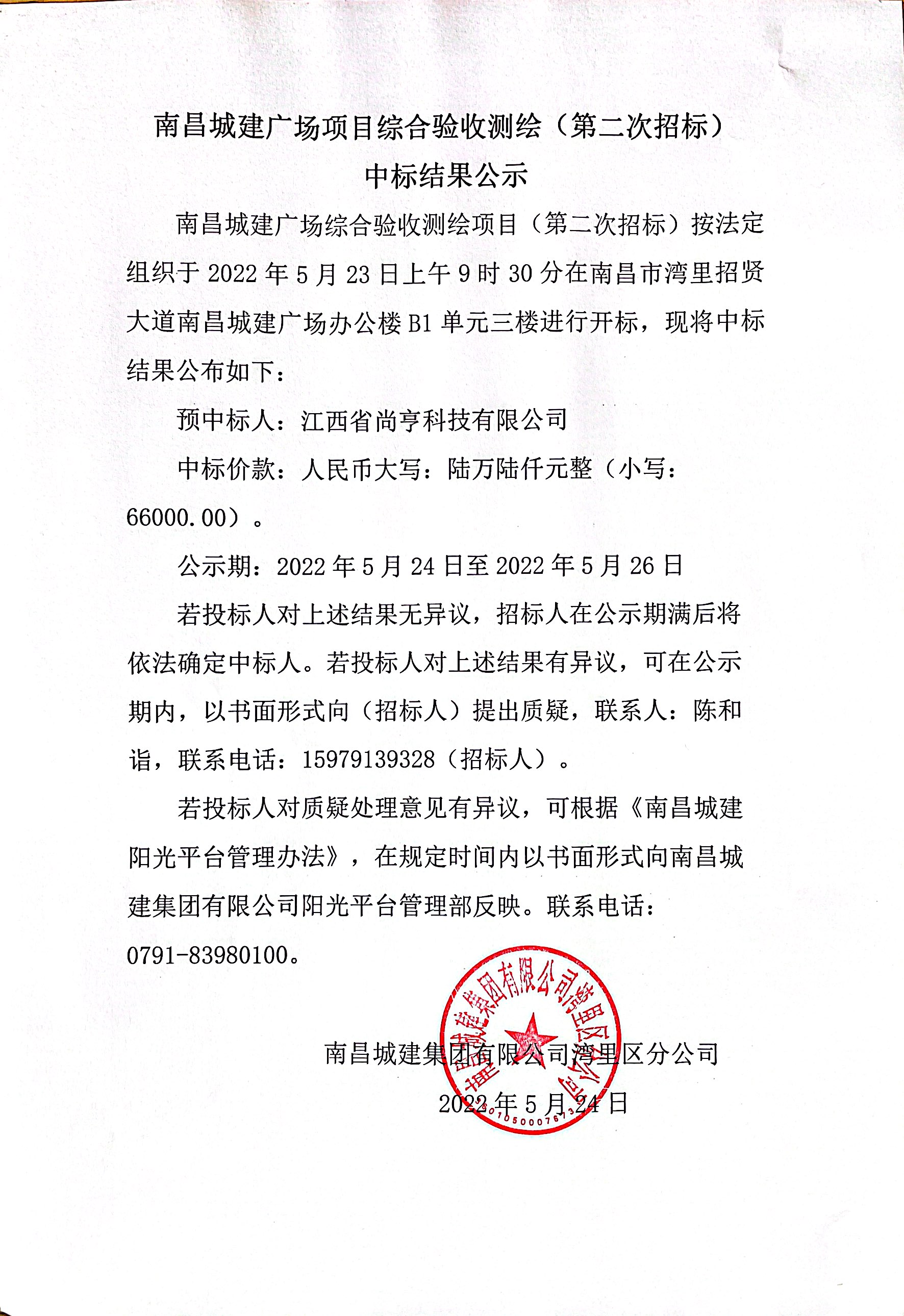 若投标人对上述结果无异议,招标人在公示期满后将依法确定中标人。若投标人对上述结果有异议,可在公示期内,以书面形式向(招标人)提出质疑,联系人:陈和诣,联系电话:15979139328(招标人)。