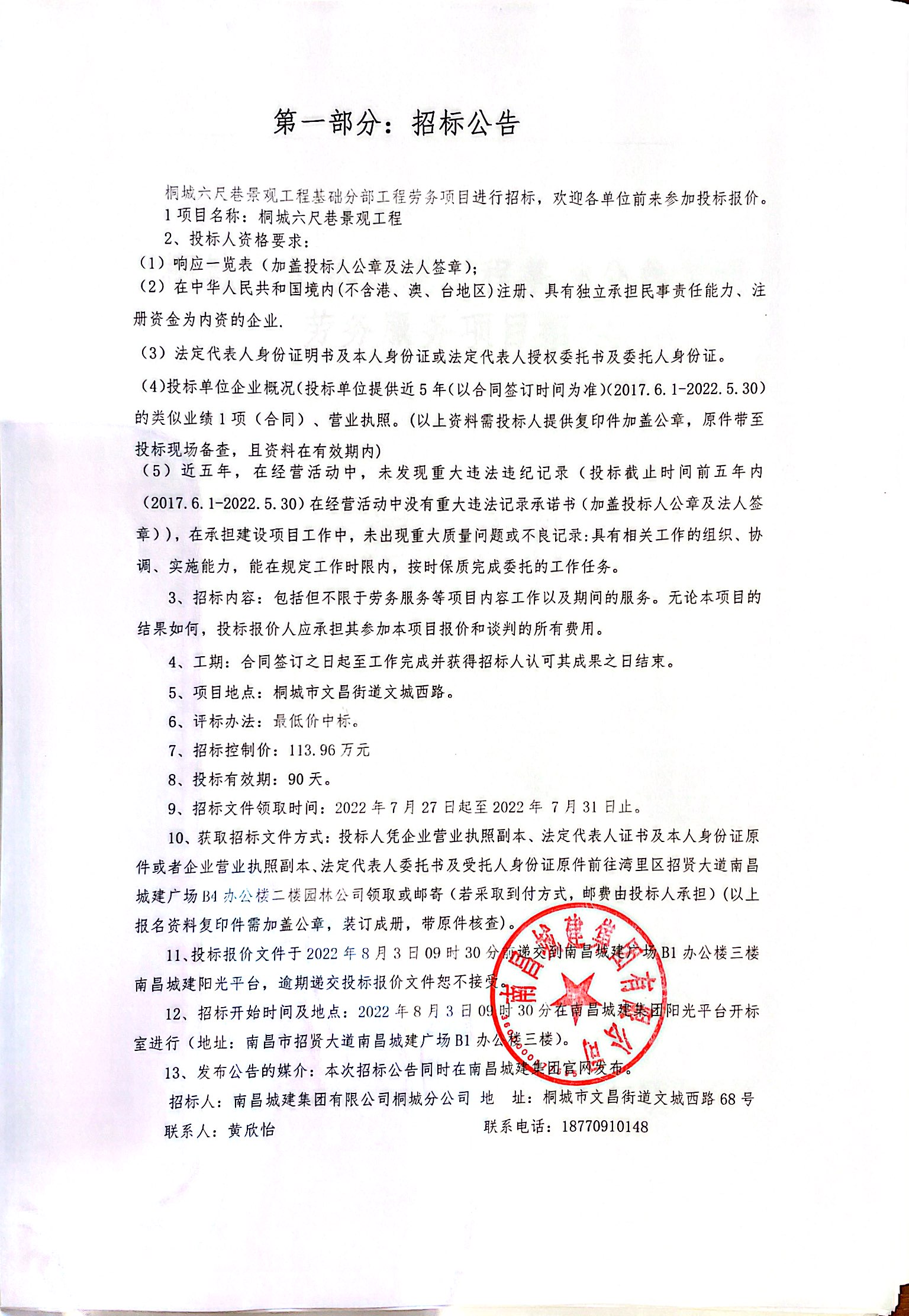 桐城六尺巷景观工程基础分部工程劳务项目进行招标,欢迎各单位前来参加投标报价。