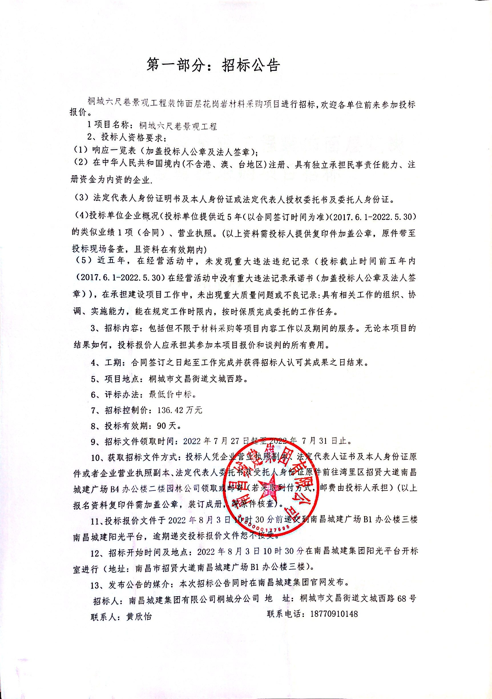 桐城六尺巷景观工程装饰面层花岗岩材料采购项目进行招标,欢迎各单位前来参加投标报价。