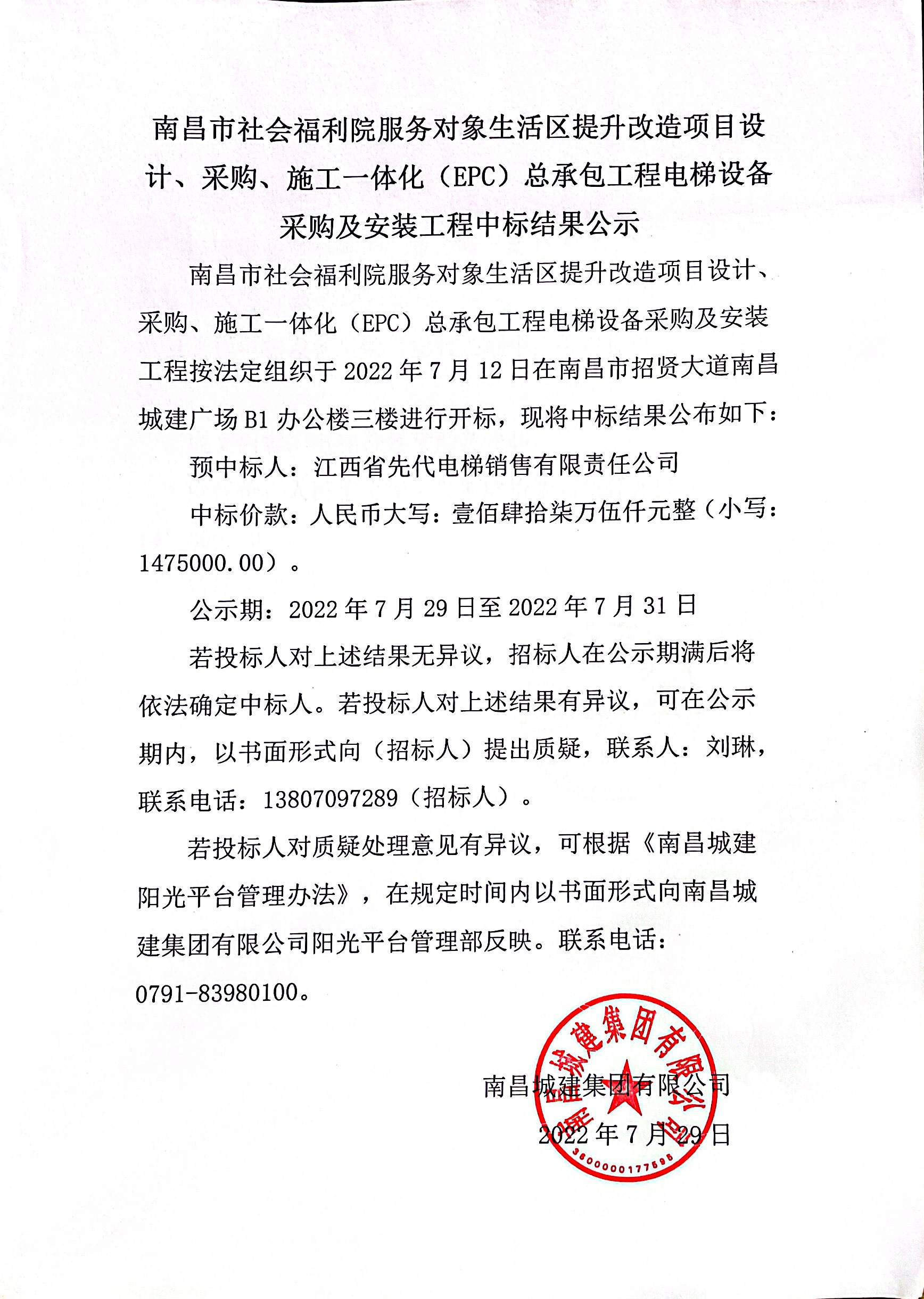 南昌市社会福利院服务对象生活区提升改造项目设计、采购、施工一体化(EPC)总承包工程电梯设备采购及安装工程按法定组织于2022年7月12日在南昌市招贤大道威廉体育广场B1办公楼三楼进行开标,现将中标结果公布如下: