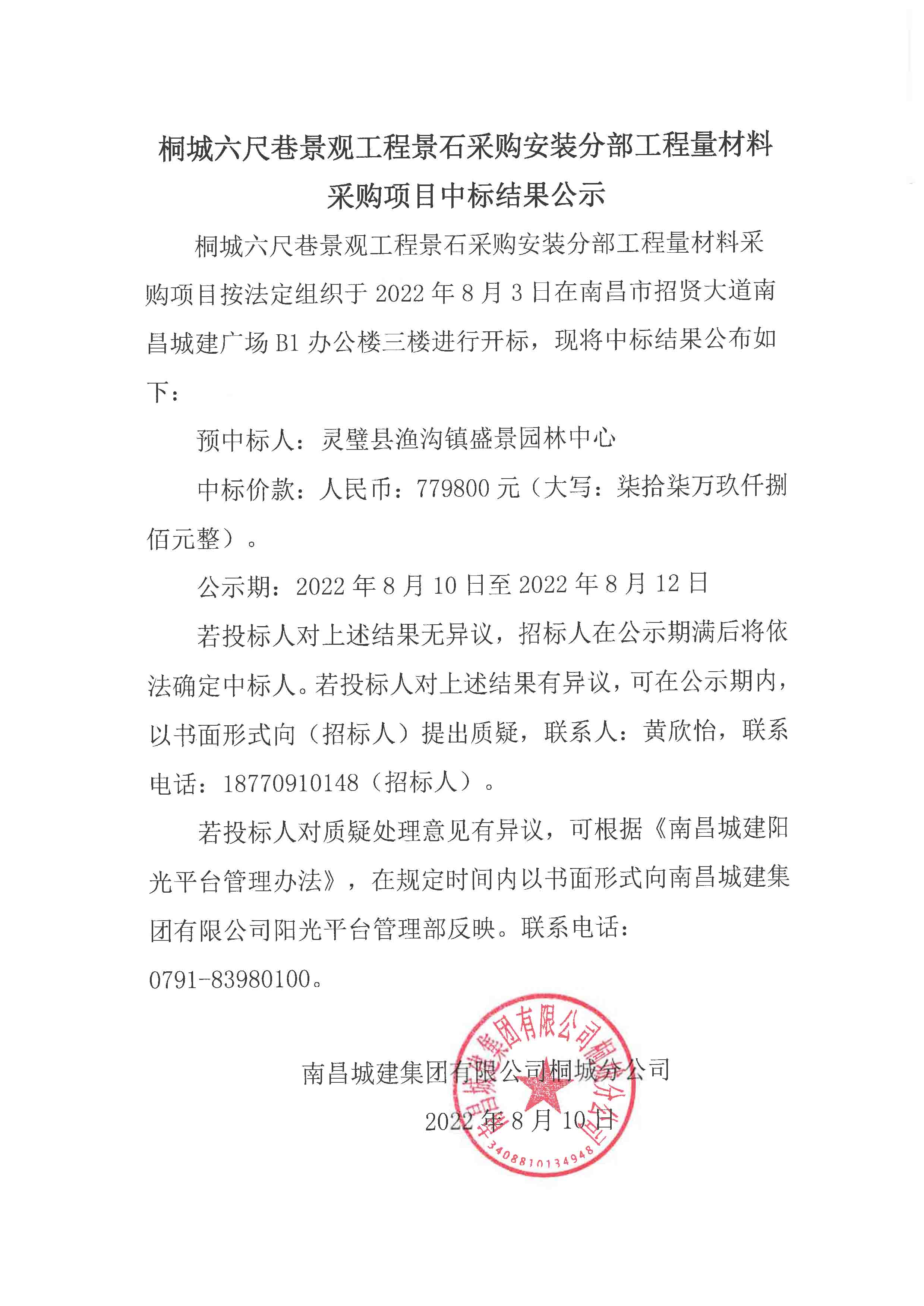 桐城六尺巷景观工程景石采购安装分部工程量材料采购项目按法定组织于2022年8月3日在南昌市招贤大道威廉体育广场B1办公楼三楼进行开标,现将中标结果公布如下: