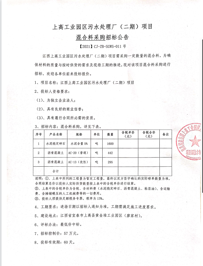 江西上高工业园区污水处理厂(二期)项目需采购一定数量的混合料,为确保材料的质量与按时供货的需求及现场工期的推进,现对该项目混合料采购进行招标,欢迎各单位前来投标报价。