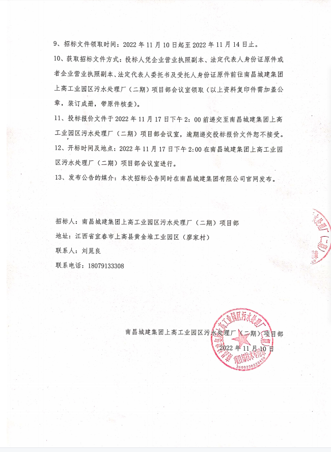 12、开标时间及地点:2022年11月17日下午2:00在威廉体育集团上高工业园区污水处理厂(二期)项目部会议室进行。