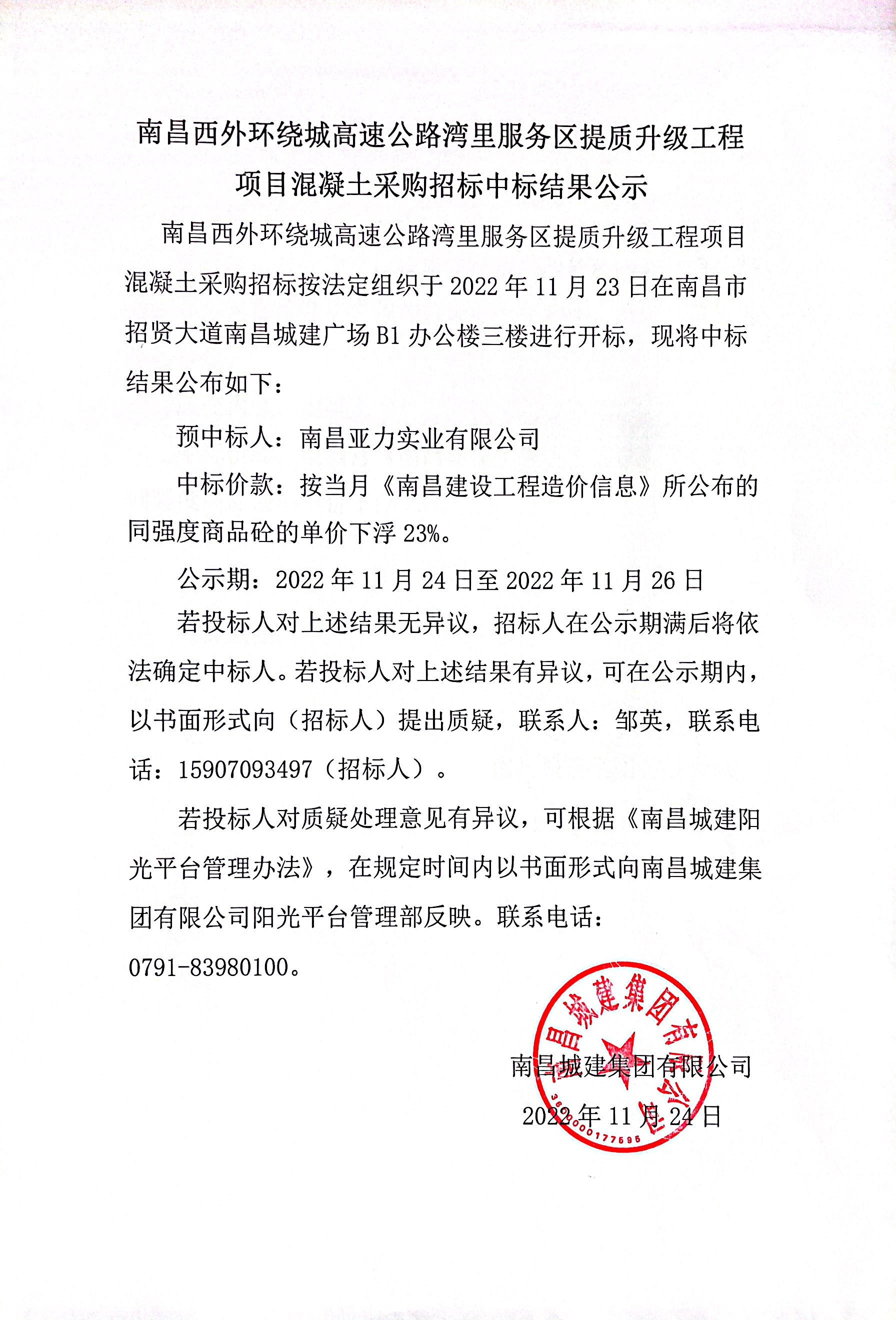 南昌西外环绕城高速公路湾里服务区提质升级工程项目混凝土采购招标按法定组织于2022年11月23日在南昌市招贤大道威廉体育广场B1办公楼三楼进行开标,现将中标结果公布如下: