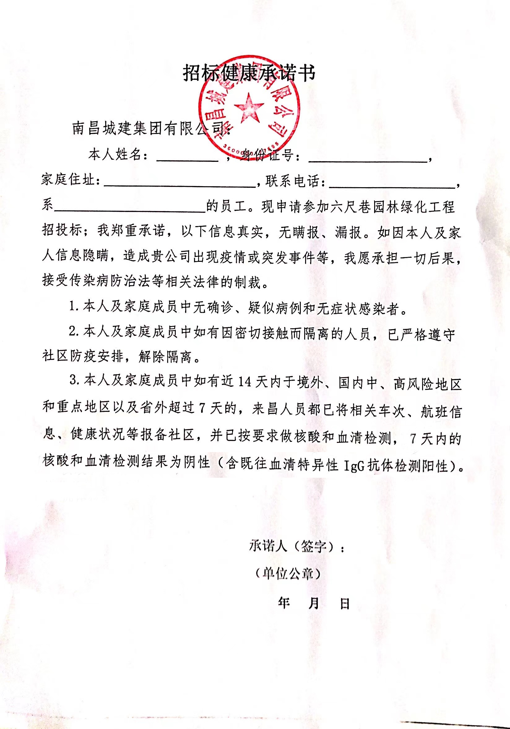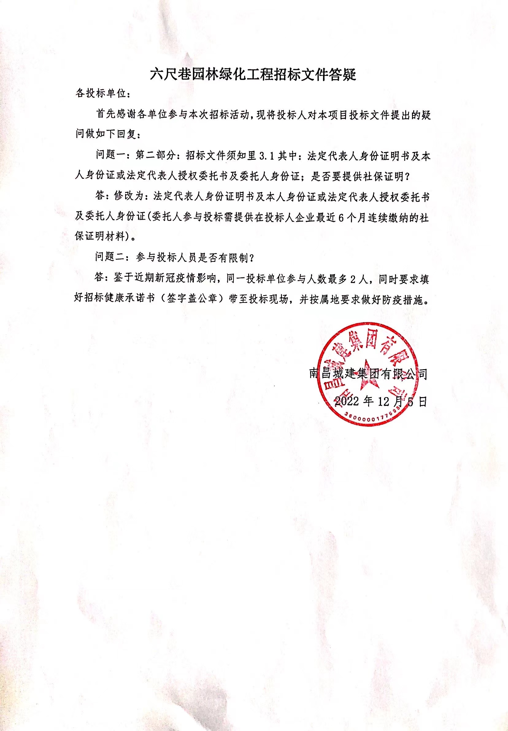 答:鉴于近期新冠疫情影响,同一投标单位参与人数最多2人,同时要求填好招标健康承诺书(签字盖公章)带至投标现场,并按属地要求做好防疫措施。