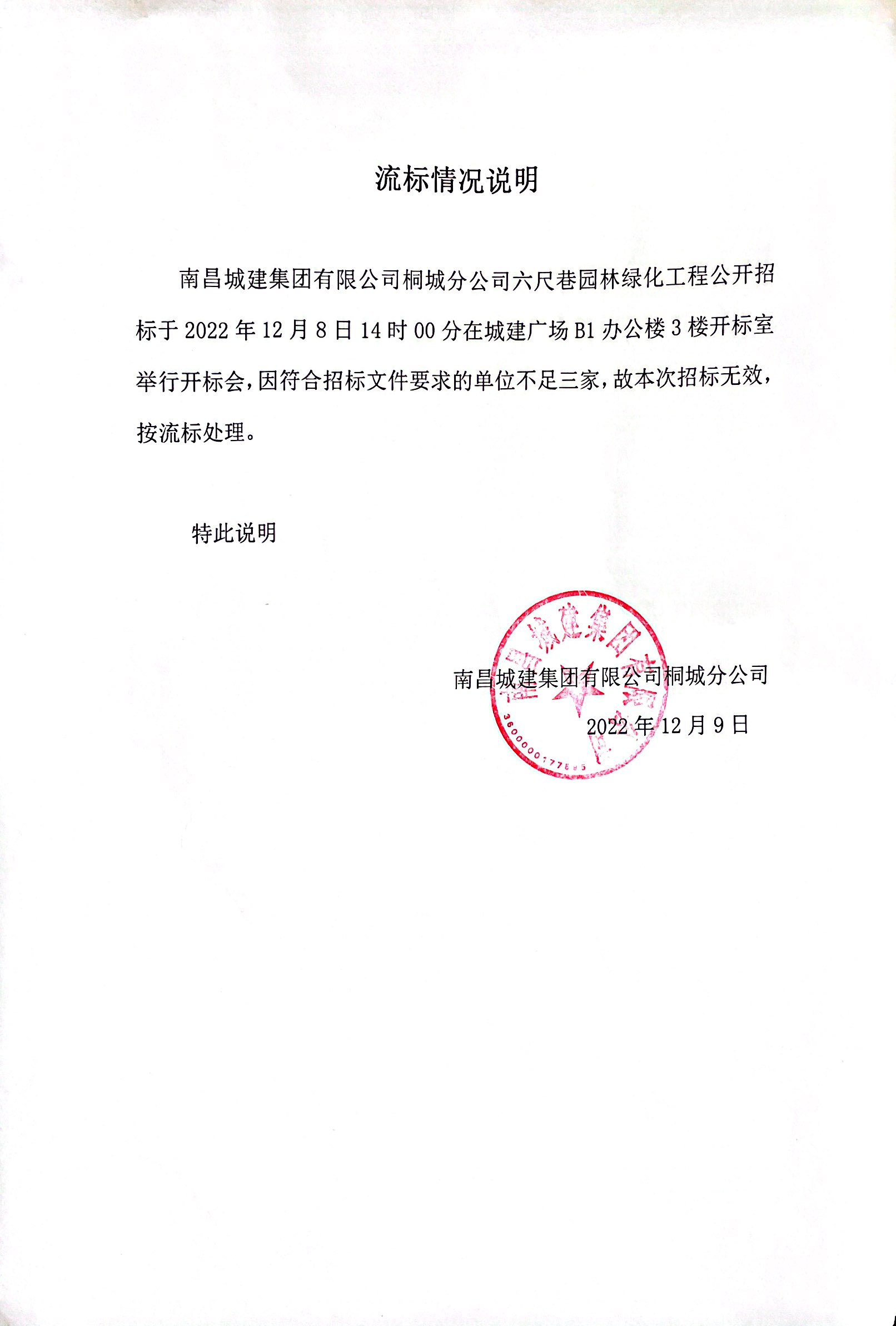 威廉体育集团有限公司桐城分公司六尺巷园林绿化工程公开招标于2022年12月8日14时00分在城建广场B1办公楼3楼开标室举行开标会,因符合招标文件要求的单位不足三家,故本次招标无效,按流标处理。
