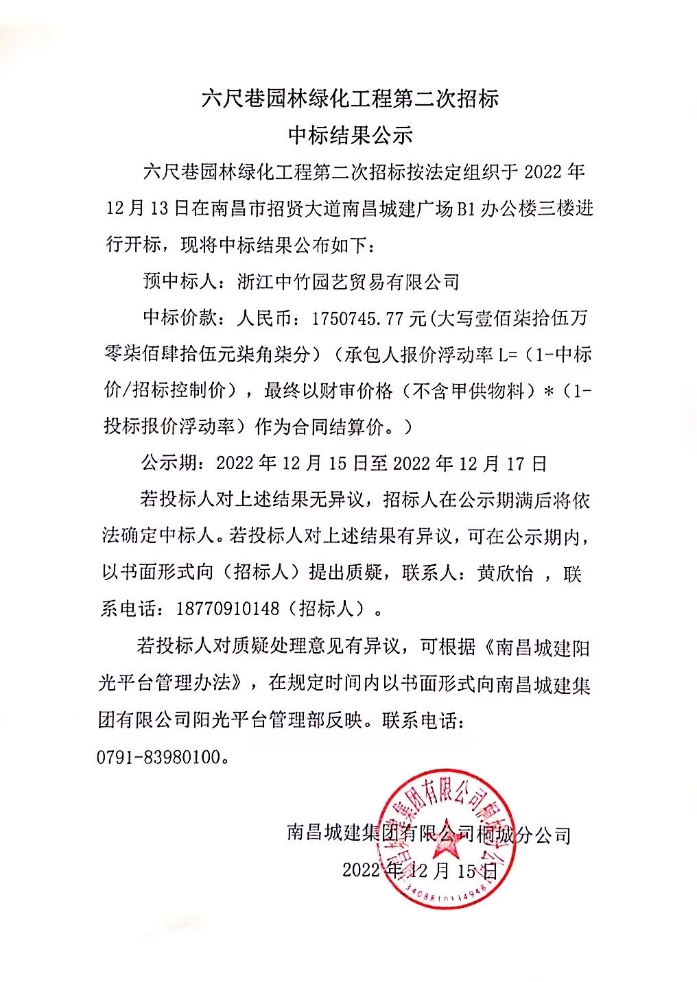 六尺巷园林绿化工程第二次招标按法定组织于2022年12月13日在南昌市招贤大道威廉体育广场B1办公楼三楼进行开标,现将中标结果公布如下: