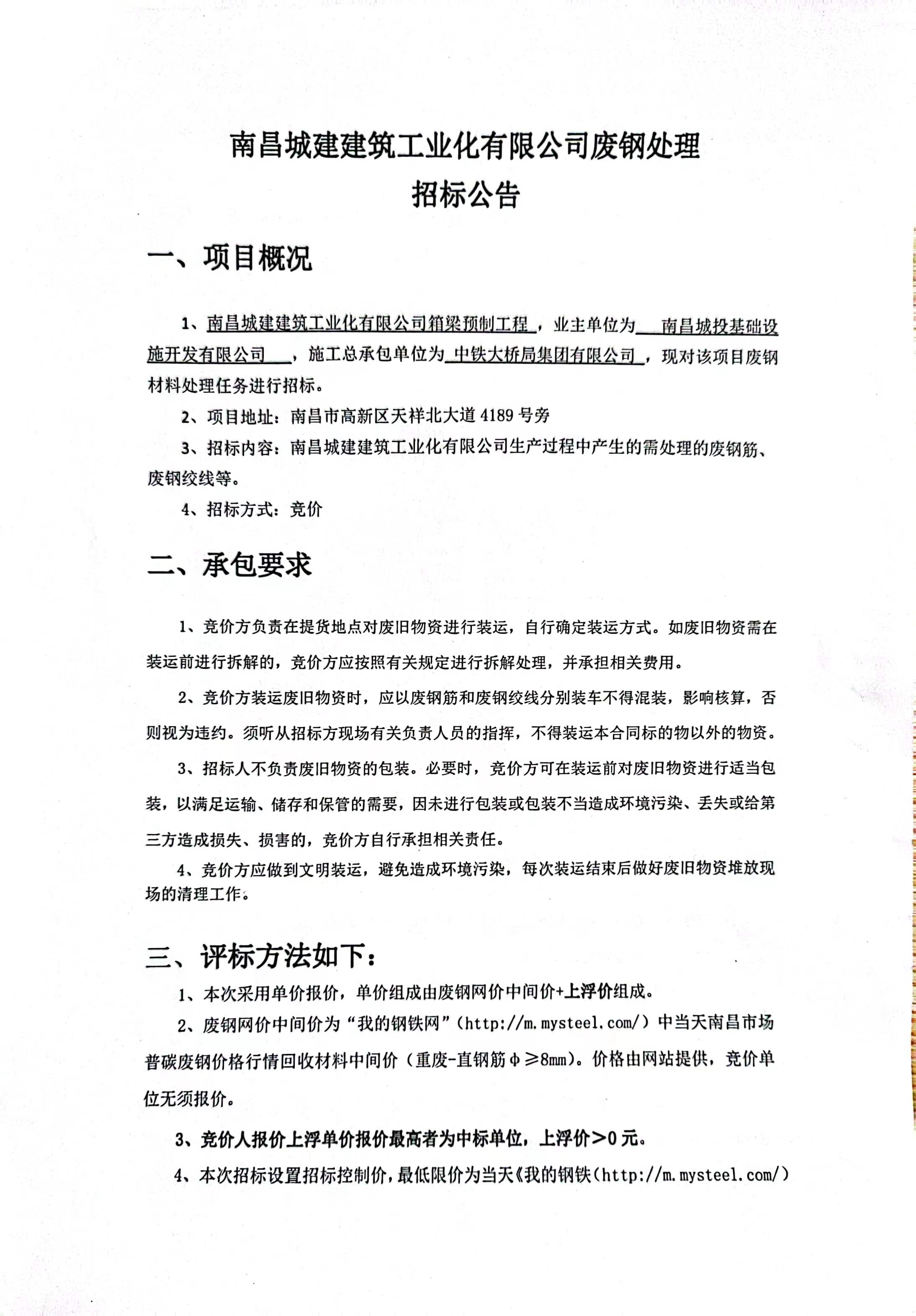 1、威廉体育建筑工业化有限公司箱梁预制工程 ,业主单位为 南昌城投基础设施开发有限公司 ,施工总承包单位为 中铁大桥局集团有限公司 ,现对该项目废钢材料处理任务进行招标。