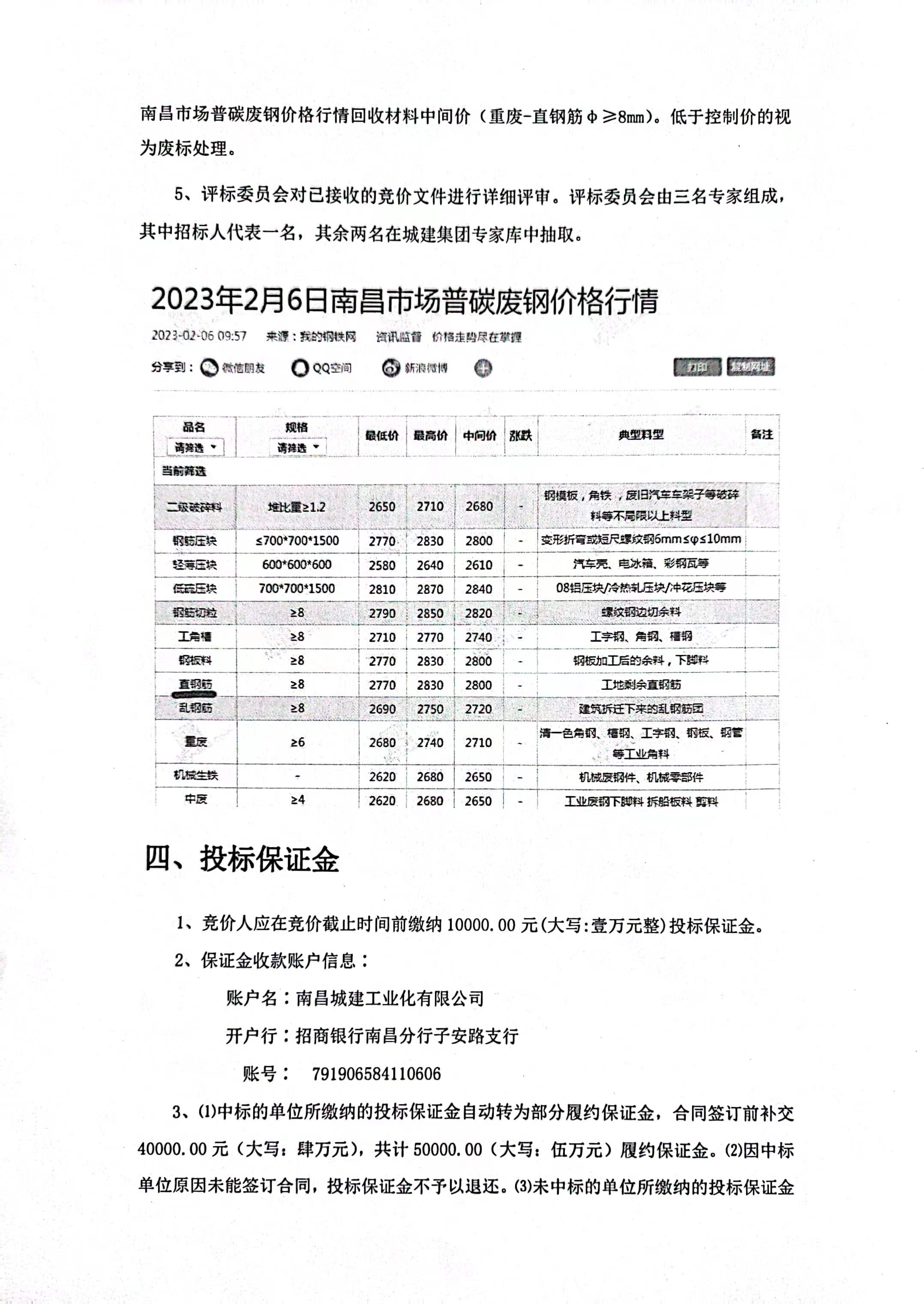4、 本次招标设置招标控制价,最低限价为当天《我的钢铁(http://m.mysteel.com/)南昌市场普碳废钢价格行情回收材料中间价(重废-直钢筋φ≥8mm)。低于控制价的视为废标处理。