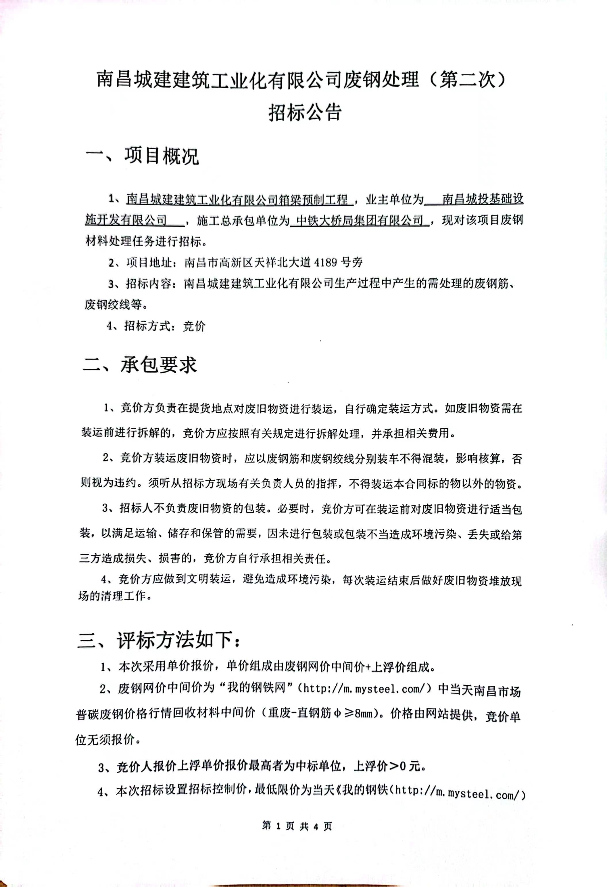 1、威廉体育建筑工业化有限公司箱梁预制工程 ,业主单位为 南昌城投基础设施开发有限公司 ,施工总承包单位为 中铁大桥局集团有限公司 ,现对该项目废钢材料处理任务进行招标。