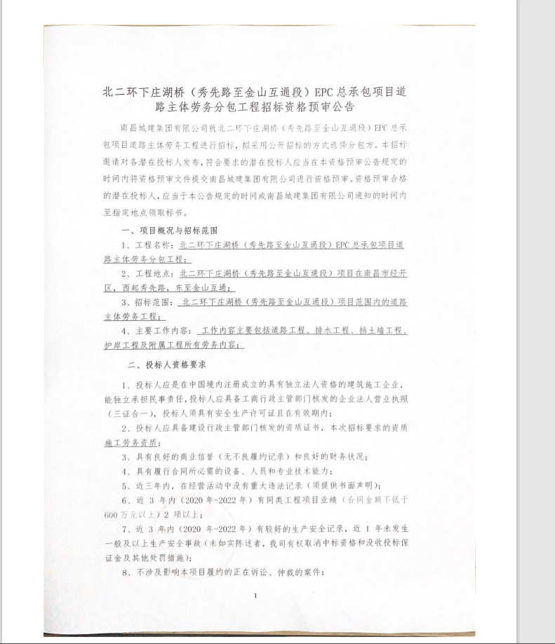 威廉体育集团有限公司就北二环下庄湖桥(秀先路至金山互通段)EPC总承包项目道路主体劳务工程进行招标,拟采用公开招标的方式选择分包方。本招标邀请对各潜在投标人发布,符合要求的潜在投标人应当在本资格预审公告规定的时间内将资格预审文件提交威廉体育集团有限公司进行资格预审。资格预审合格的潜在投标人,应当于本公告规定的时间或威廉体育集团有限公司通知的时间内至指定地点领取标书。