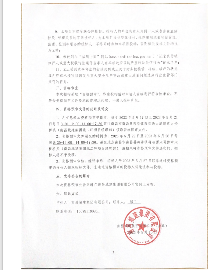 2、资格预审文件递交的时间为:2023年5月22日至2023年5月26日每日8:30-12:00、14:00-17:30。递交地点南昌市南昌县蒋巷镇蒋巷西大道豫章大桥桥头(威廉体育集团北二环项目经理部),逾期未将资格预审文件递交的,招标人将不予受理。