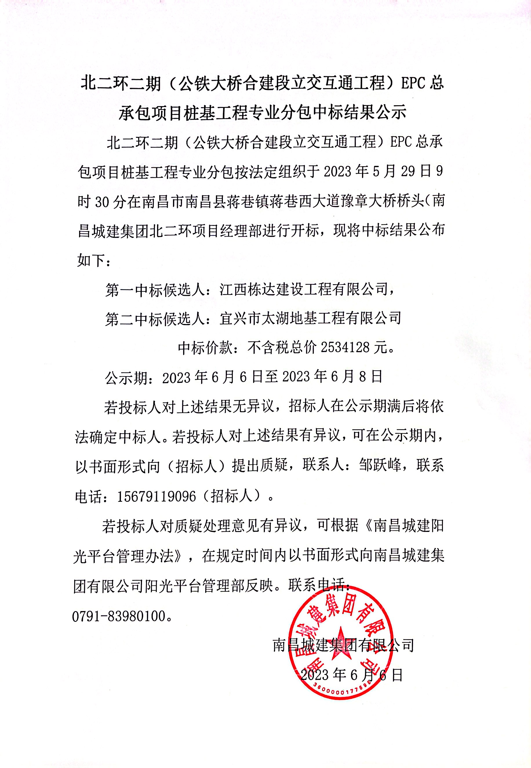 北二环二期(公铁大桥合建段立交互通工程)EPC总承包项目桩基工程专业分包按法定组织于2023年5月29日9时30分在南昌市南昌县蒋巷镇蒋巷西大道豫章大桥桥头(威廉体育集团北二环项目经理部进行开标,现将中标结果公布如下: