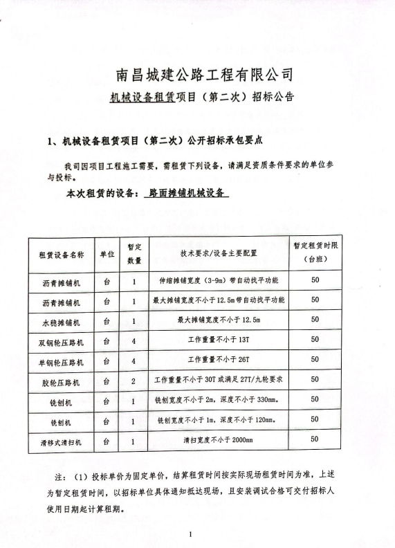 1、机械设备租赁项目(第二次)公开招标承包要点