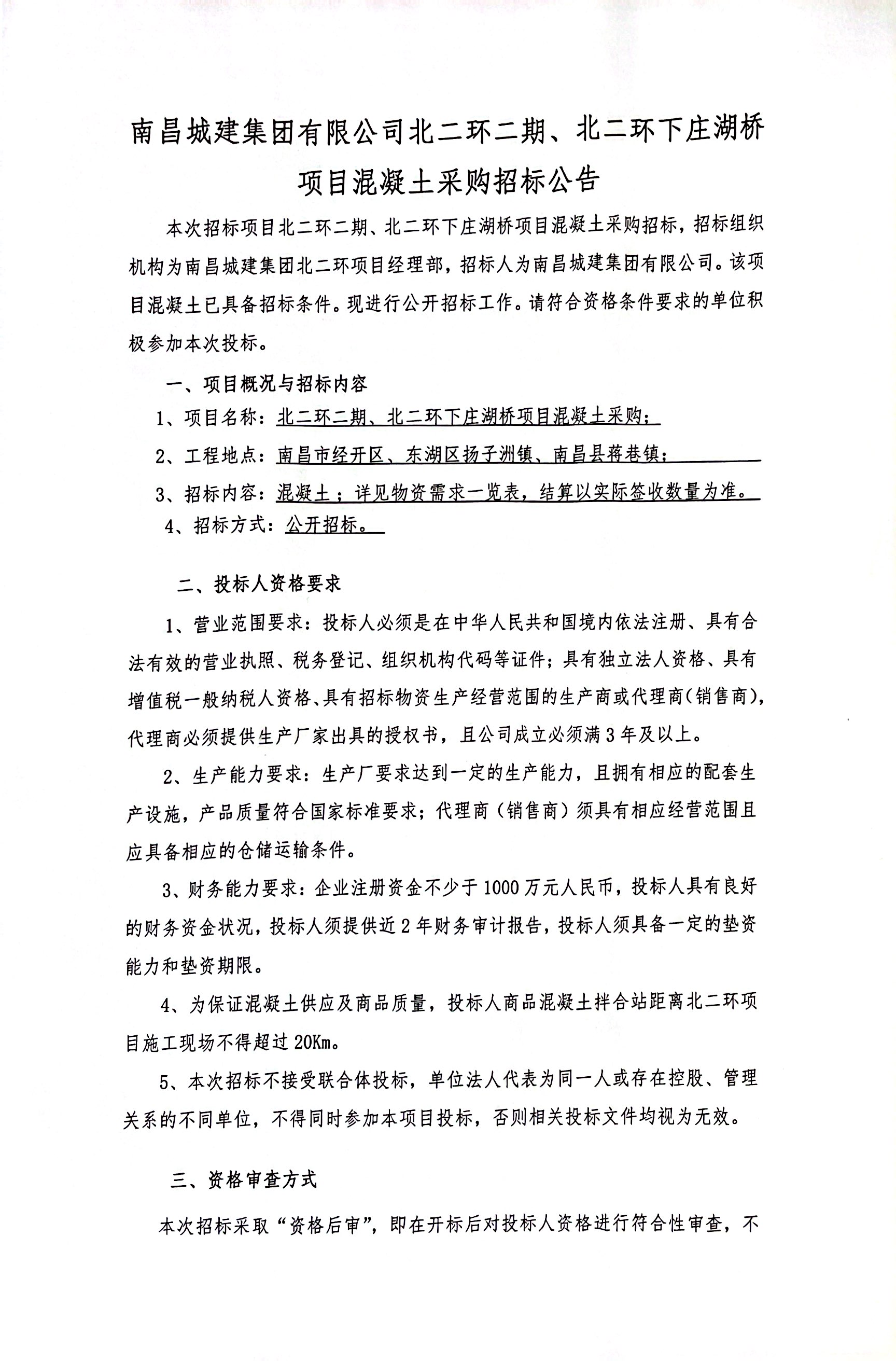 本次招标项目北二环二期、北二环下庄湖桥项目混凝土采购招标,招标组织机构为威廉体育集团北二环项目经理部,招标人为威廉体育集团有限公司。该项目混凝土已具备招标条件。现进行公开招标工作。请符合资格条件要求的单位积极参加本次投标。