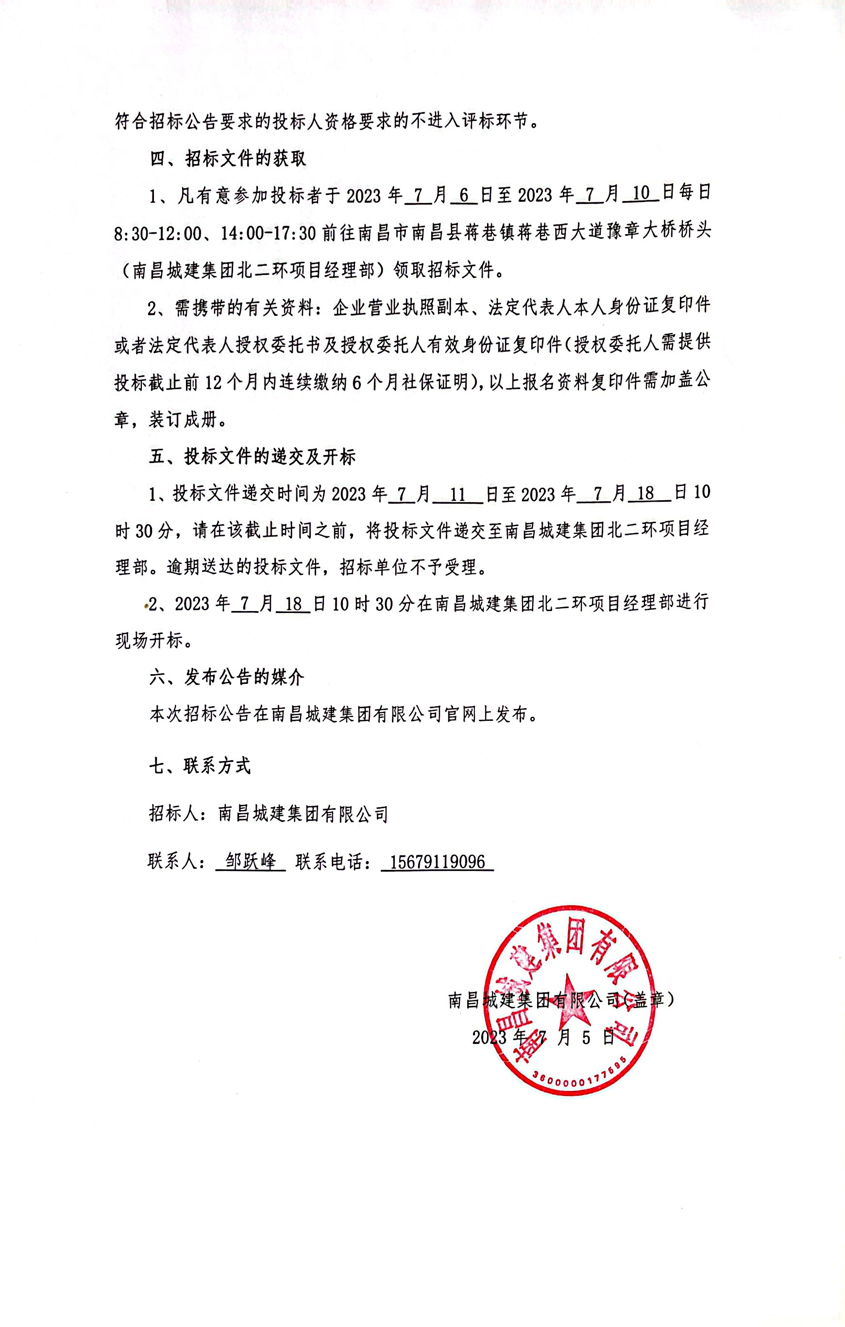1、凡有意参加投标者于2023年 7 月 6 日至2023年 7 月 10 日每日8:30-12:00、14:00-17:30前往南昌市南昌县蒋巷镇蒋巷西大道豫章大桥桥头(威廉体育集团北二环项目经理部)领取招标文件。