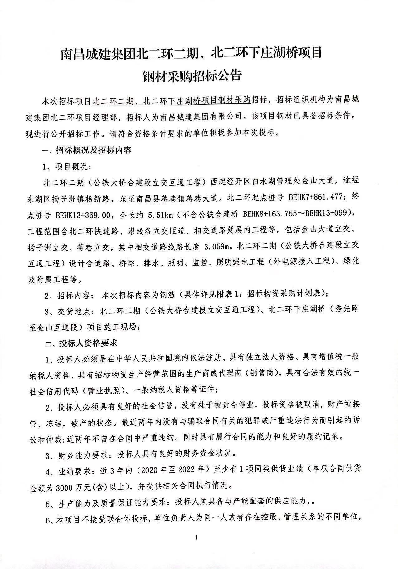 本次招标项目北二环二期、北二环下庄湖桥项目钢材采购招标,招标组织机构为威廉体育集团北二环项目经理部,招标人为威廉体育集团有限公司。该项目钢材已具备招标条件。现进行公开招标工作。请符合资格条件要求的单位积极参加本次投标。