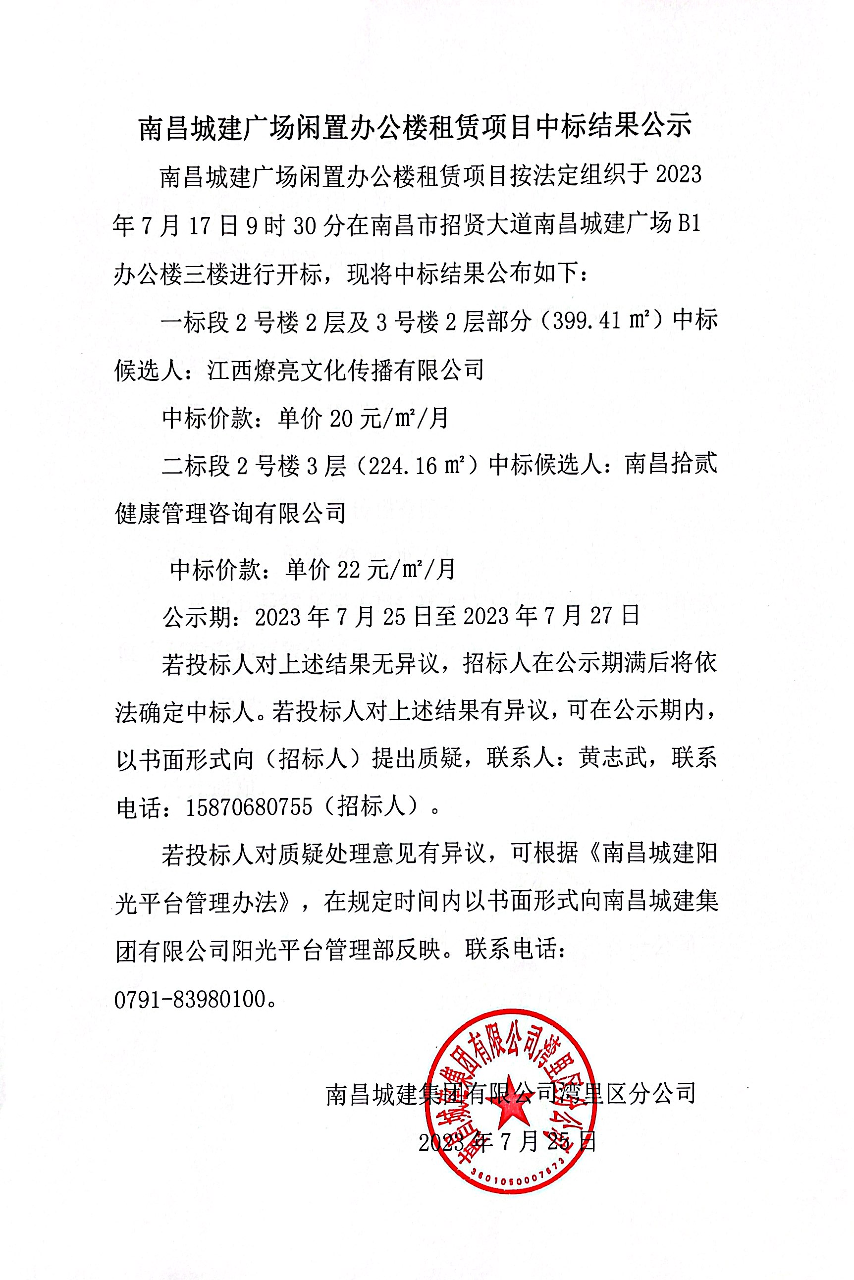 一标段2号楼2层及3号楼2层部分(399.41㎡)中标候选人:江西燎亮文化传播有限公司