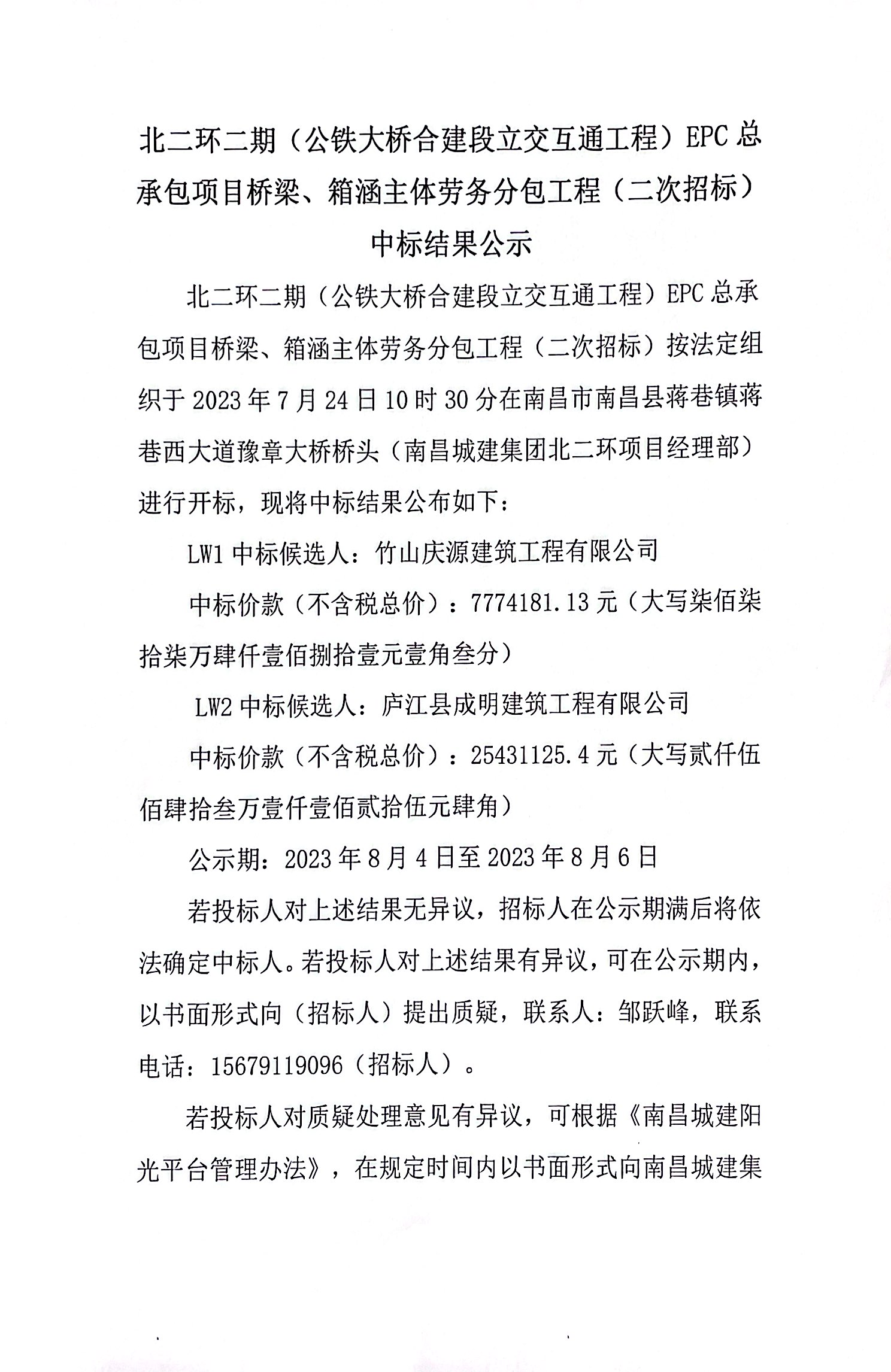 北二环二期(公铁大桥合建段立交互通工程)EPC总承包项目桥梁、箱涵主体劳务分包工程(二次招标)按法定组织于2023年7月24日10时30分在南昌市南昌县蒋巷镇蒋巷西大道豫章大桥桥头(威廉体育集团北二环项目经理部)进行开标,现将中标结果公布如下: