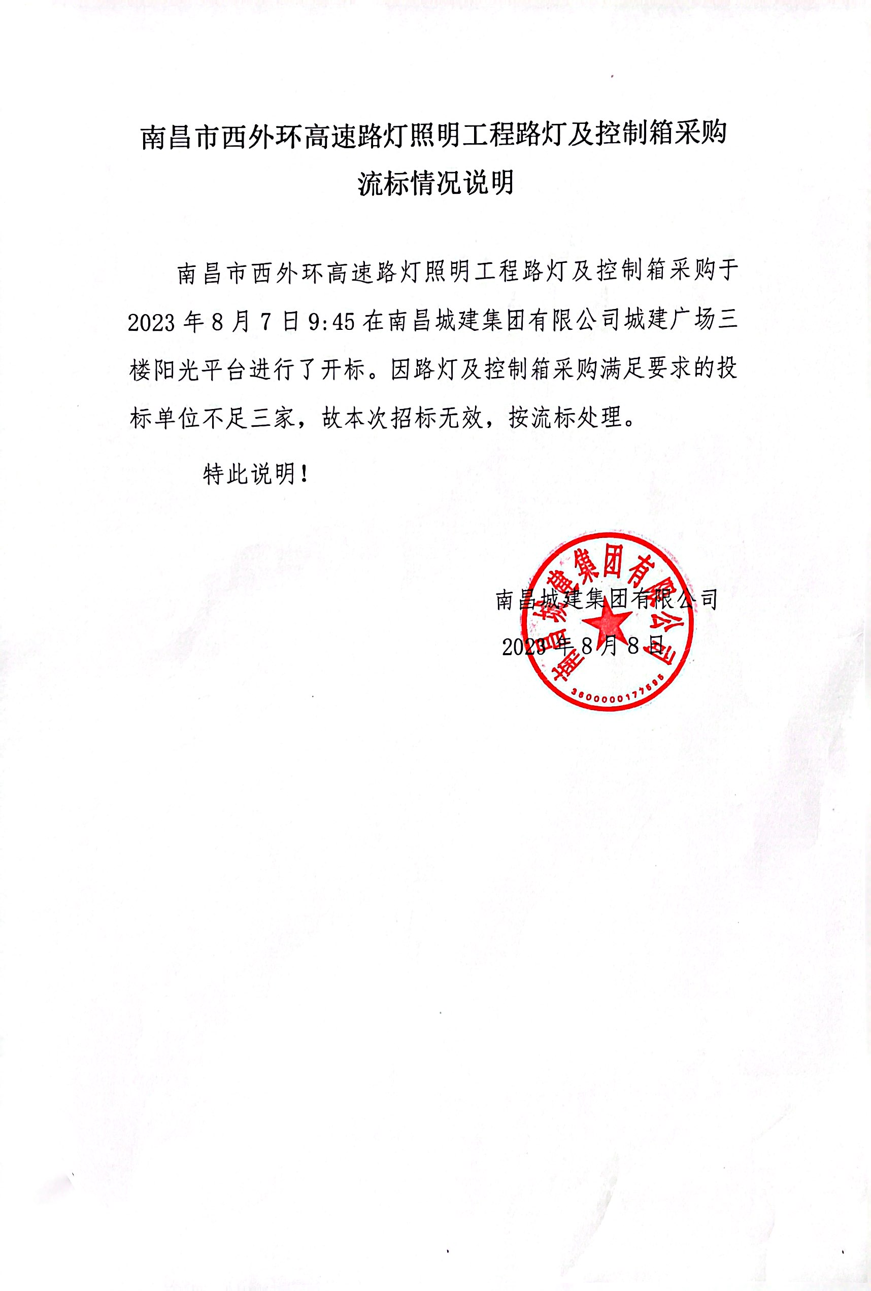 南昌市西外环高速路灯照明工程路灯及控制箱采购于2023年8月7日9:45在威廉体育集团有限公司城建广场三楼阳光平台进行了开标。因路灯及控制箱采购满足要求的投标单位不足三家,故本次招标无效,按流标处理。