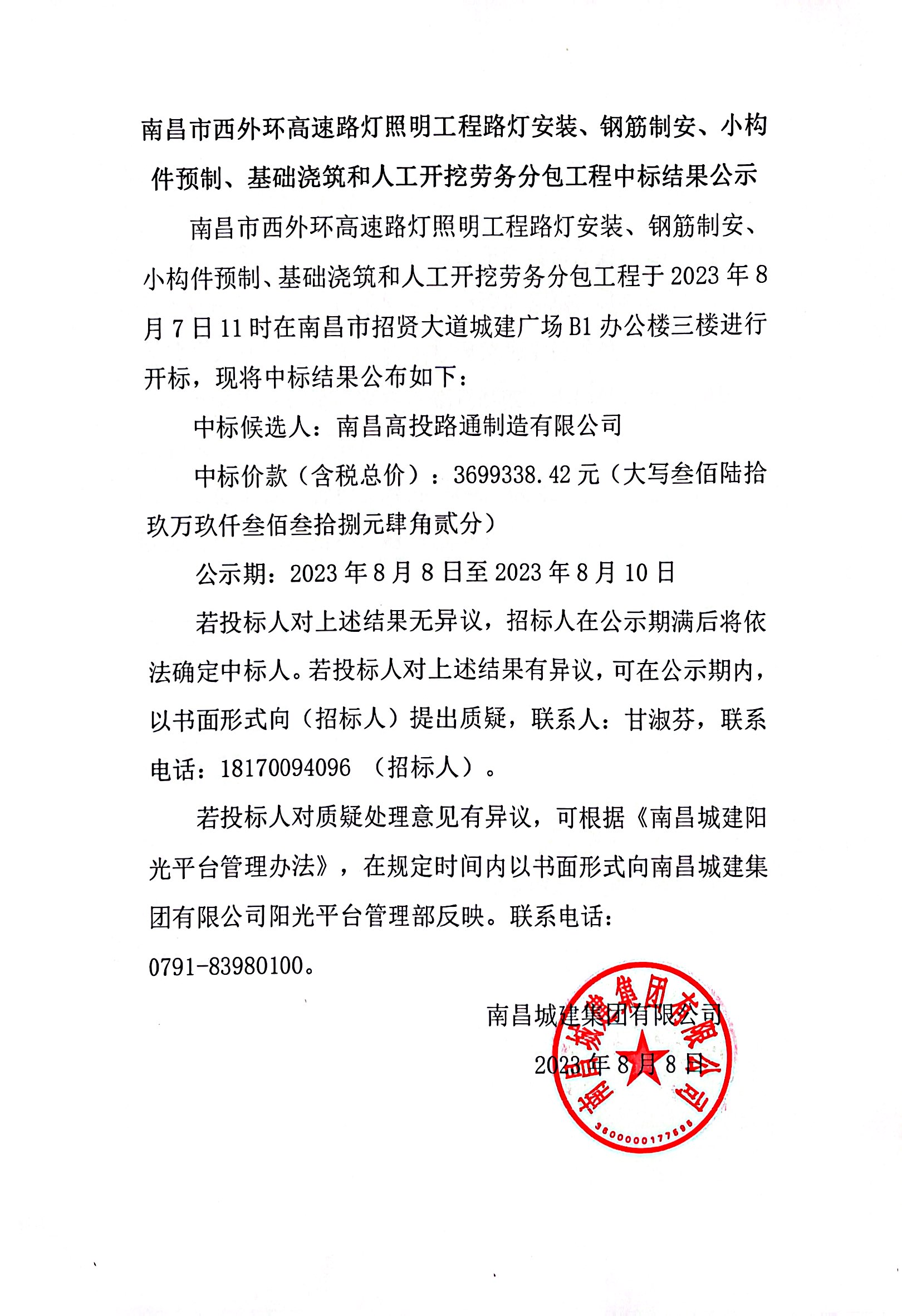 南昌市西外环高速路灯照明工程路灯安装、钢筋制安、小构件预制、基础浇筑和人工开挖劳务分包工程于2023年8月7日11时在南昌市招贤大道城建广场B1办公楼三楼进行开标,现将中标结果公布如下: