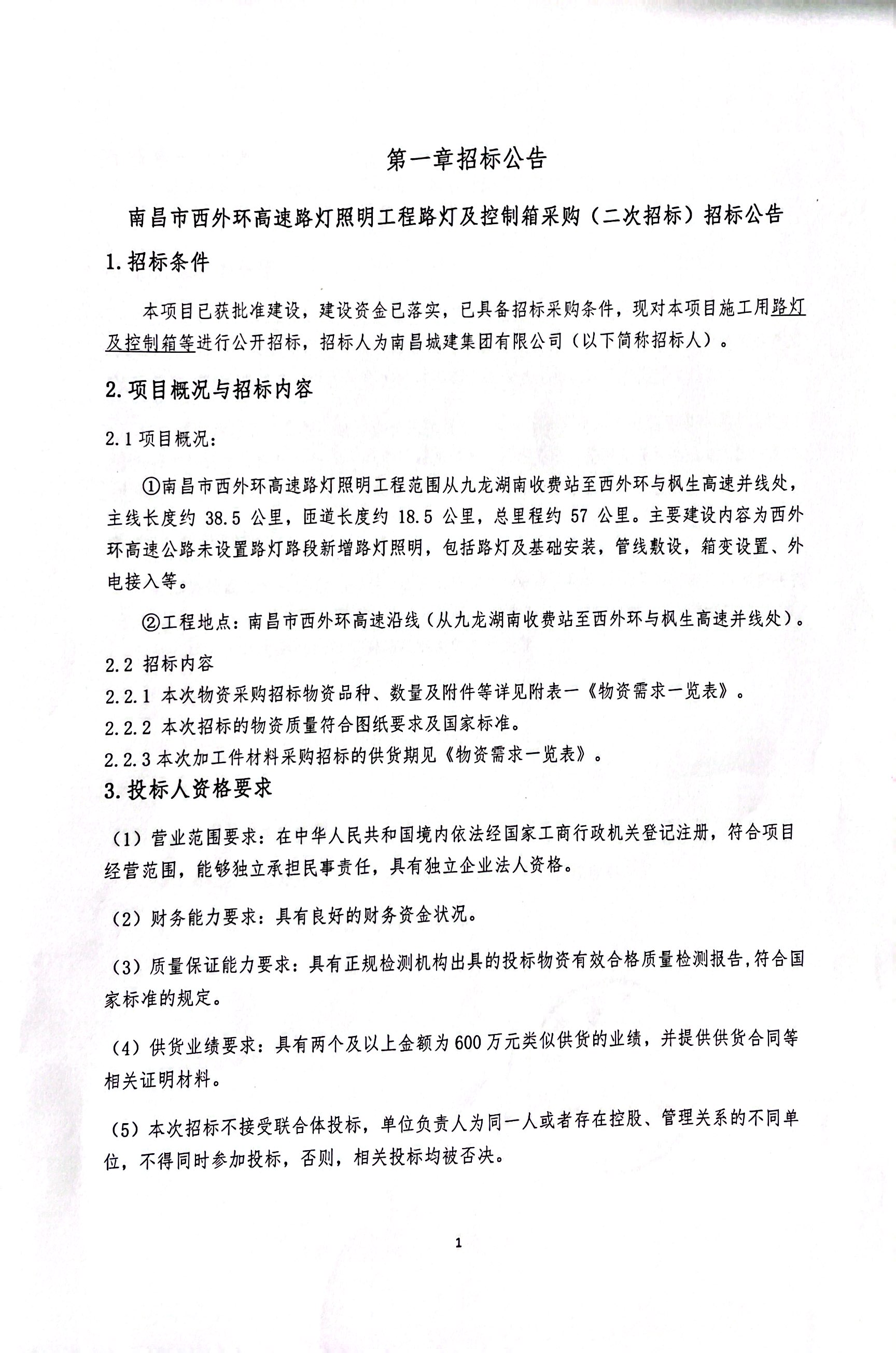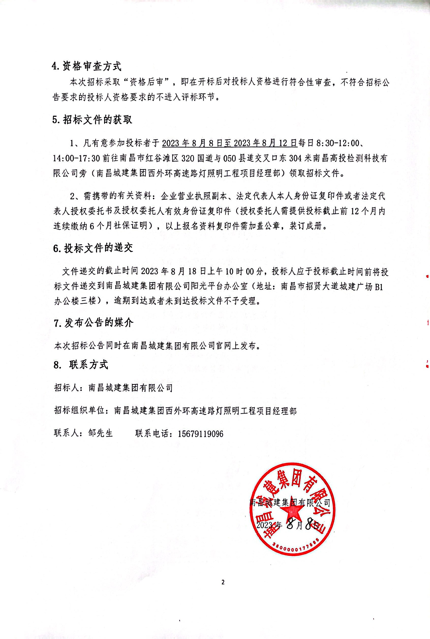 1、凡有意参加投标者于2023年8月8日至2023年8月12日每日8:30-12:00、14:00-17:30前往南昌市红谷滩区320国道与050县道交叉口东304米南昌高投检测科技有限公司旁(威廉体育集团西外环高速路灯照明工程项目经理部)领取招标文件。