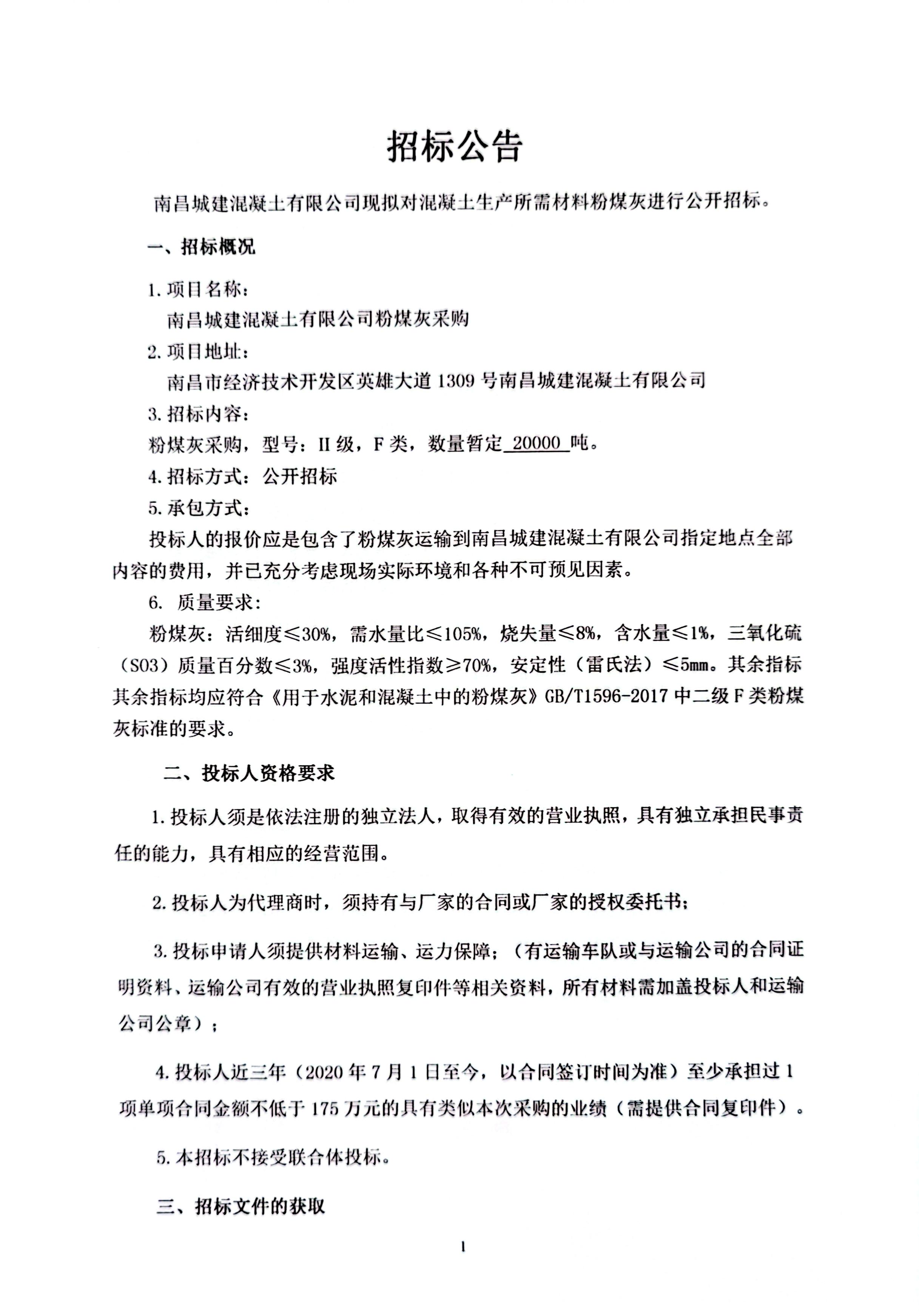 威廉体育混凝土有限公司现拟对混凝土生产所需材料粉煤灰进行公开招标。