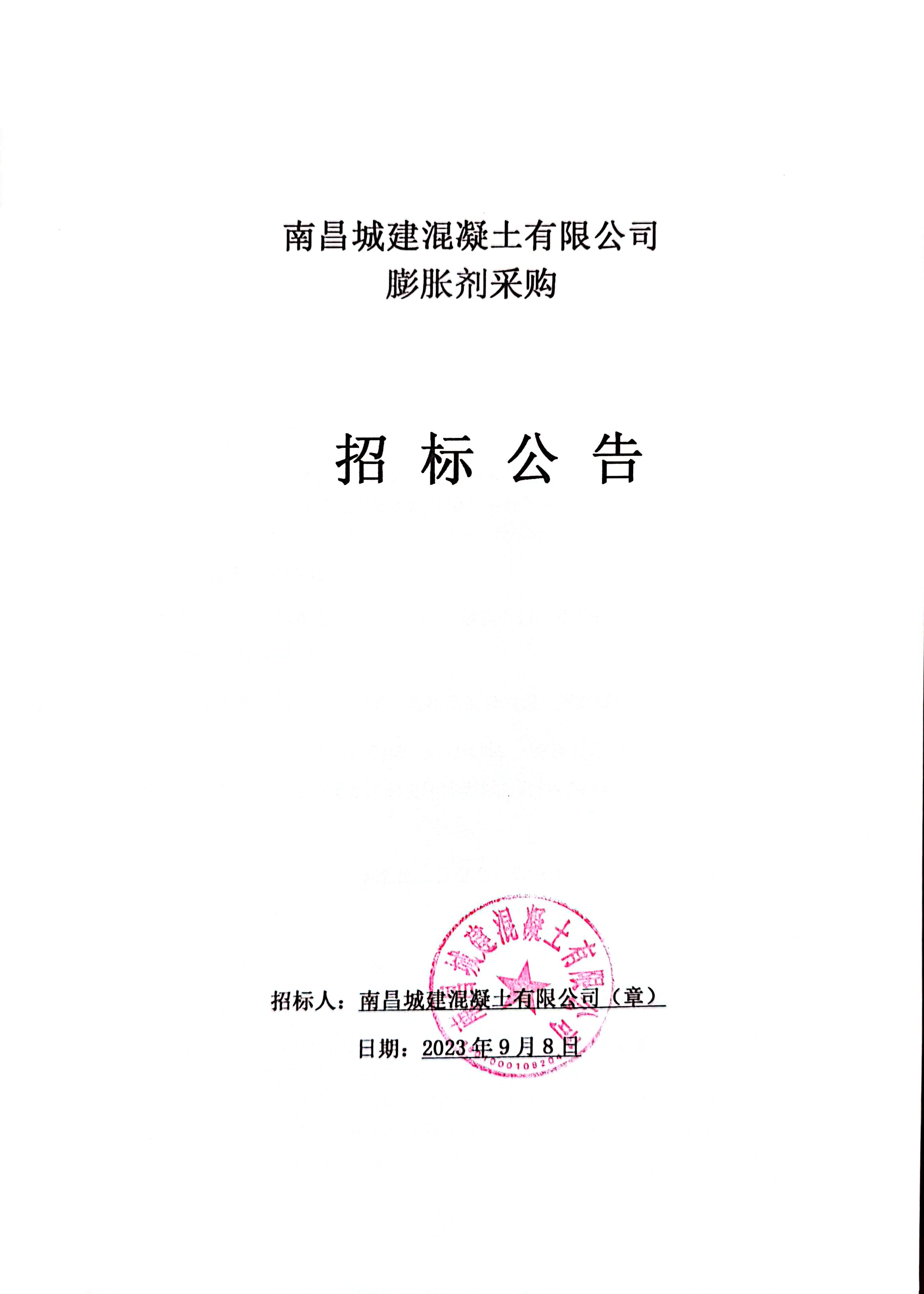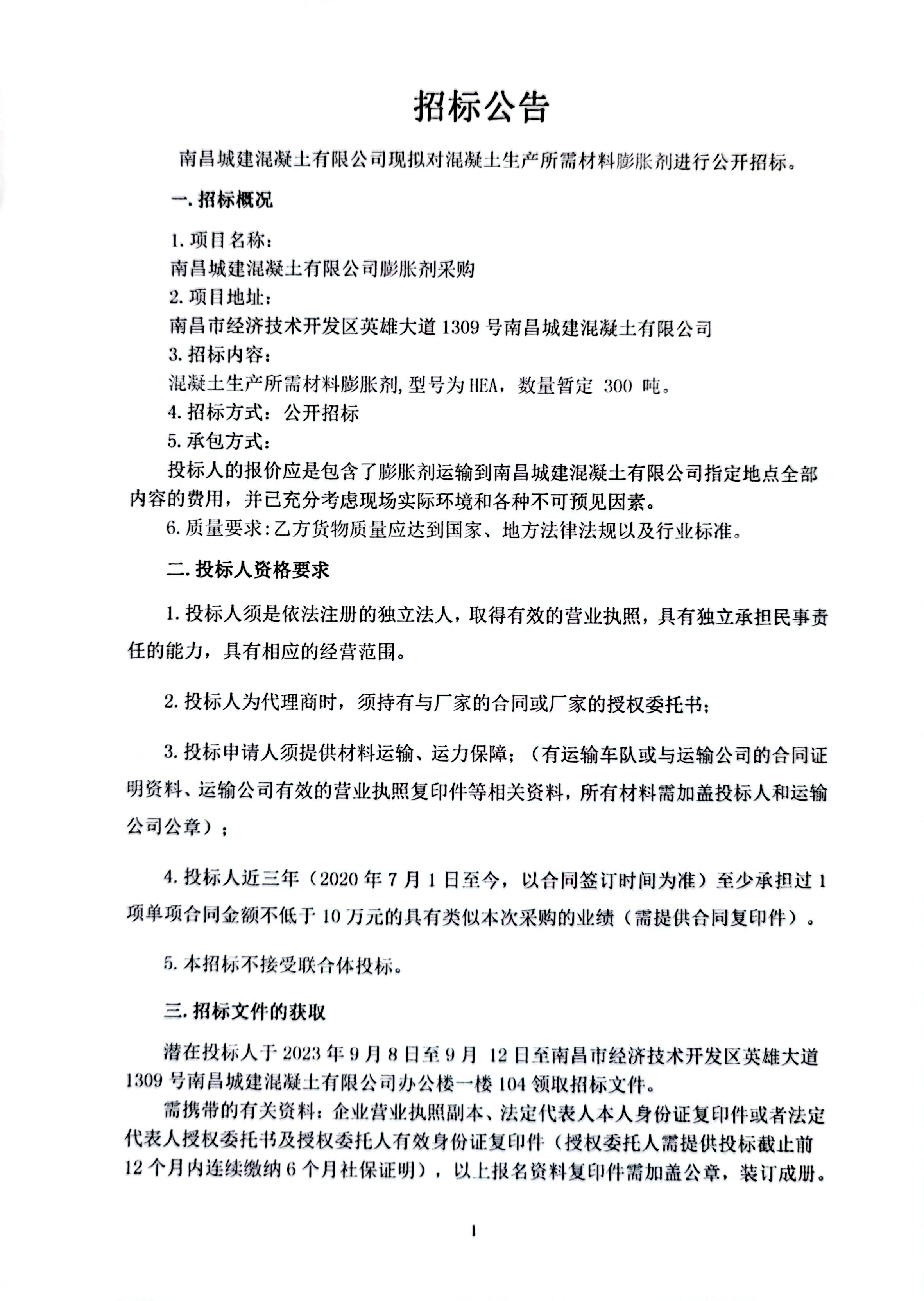 威廉体育混凝土有限公司现拟对混凝土生产所需材料膨胀剂进行公开招标。