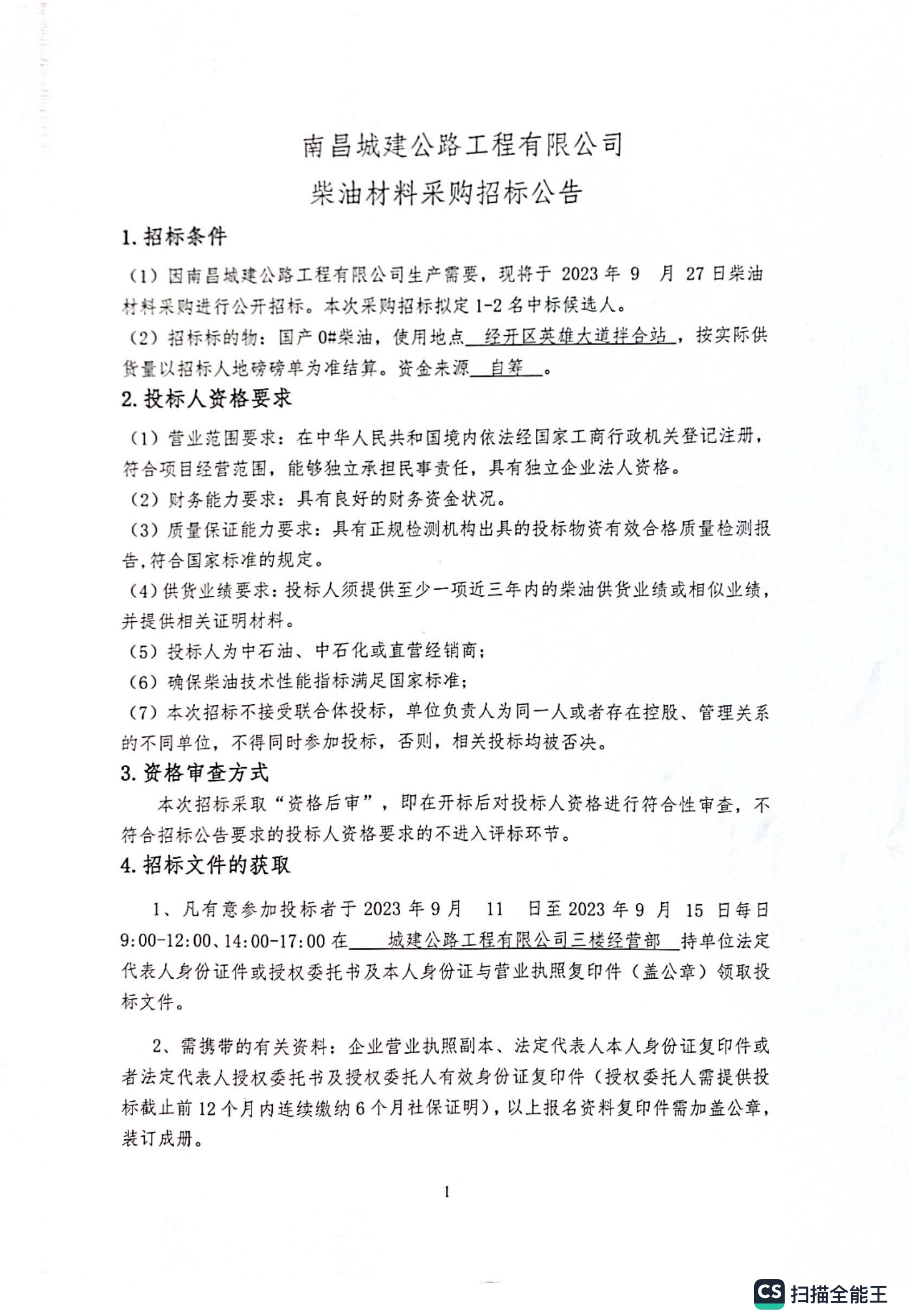 (1)因威廉体育公路工程有限公司生产需要,现将于 2023年 9 月 27日柴油材料采购进行公开招标。本次采购招标拟定1-2名中标候选人。