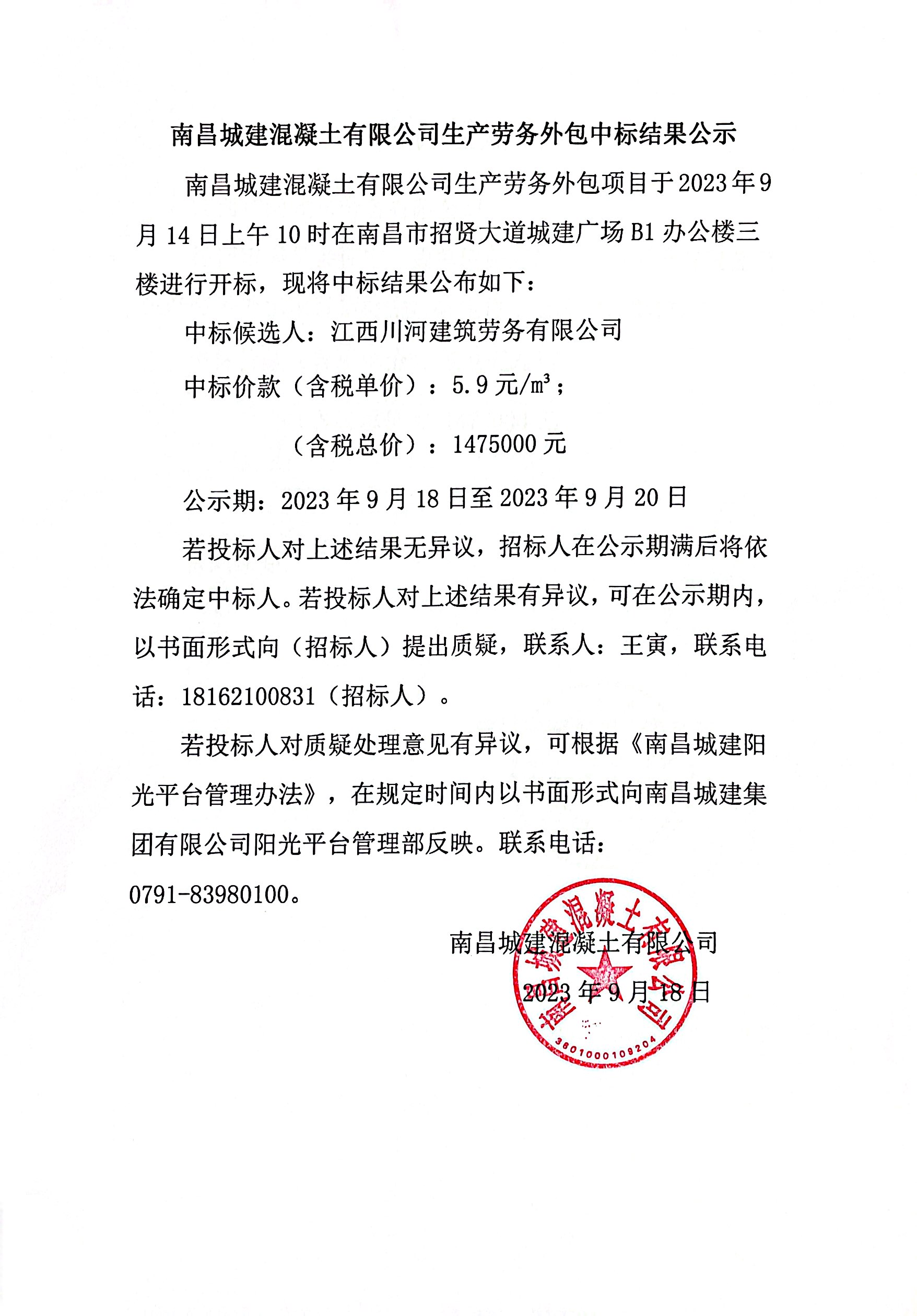 威廉体育混凝土有限公司生产劳务外包项目于2023年9月14日上午10时在南昌市招贤大道城建广场B1办公楼三楼进行开标,现将中标结果公布如下: