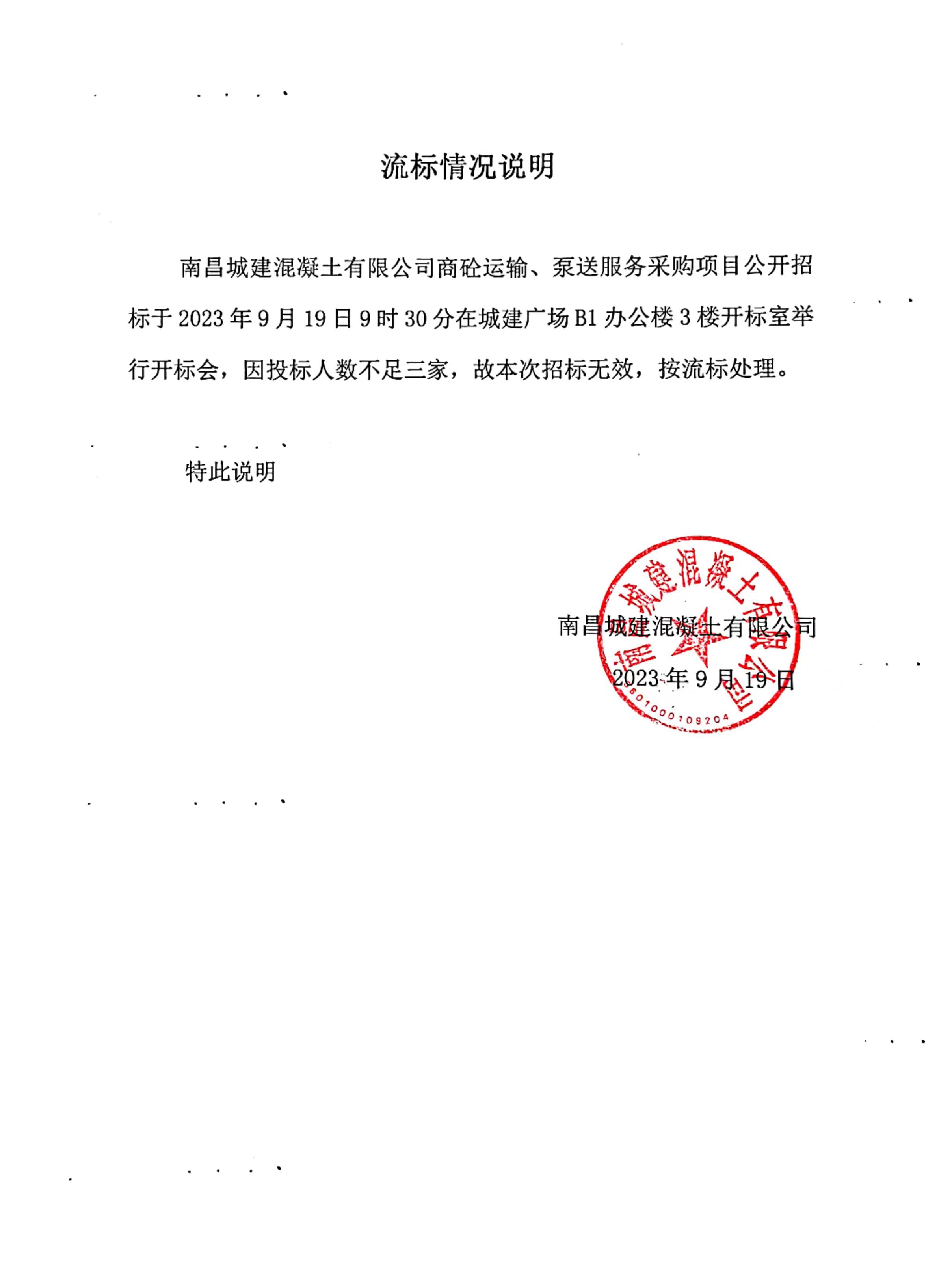 威廉体育混凝土有限公司商砼运输、泵送服务采购项目公开招标于2023年9月19日9时30分在城建广场B1办公楼3楼开标室举行开标会,因投标人数不足三家,故本次招标无效,按流标处理。