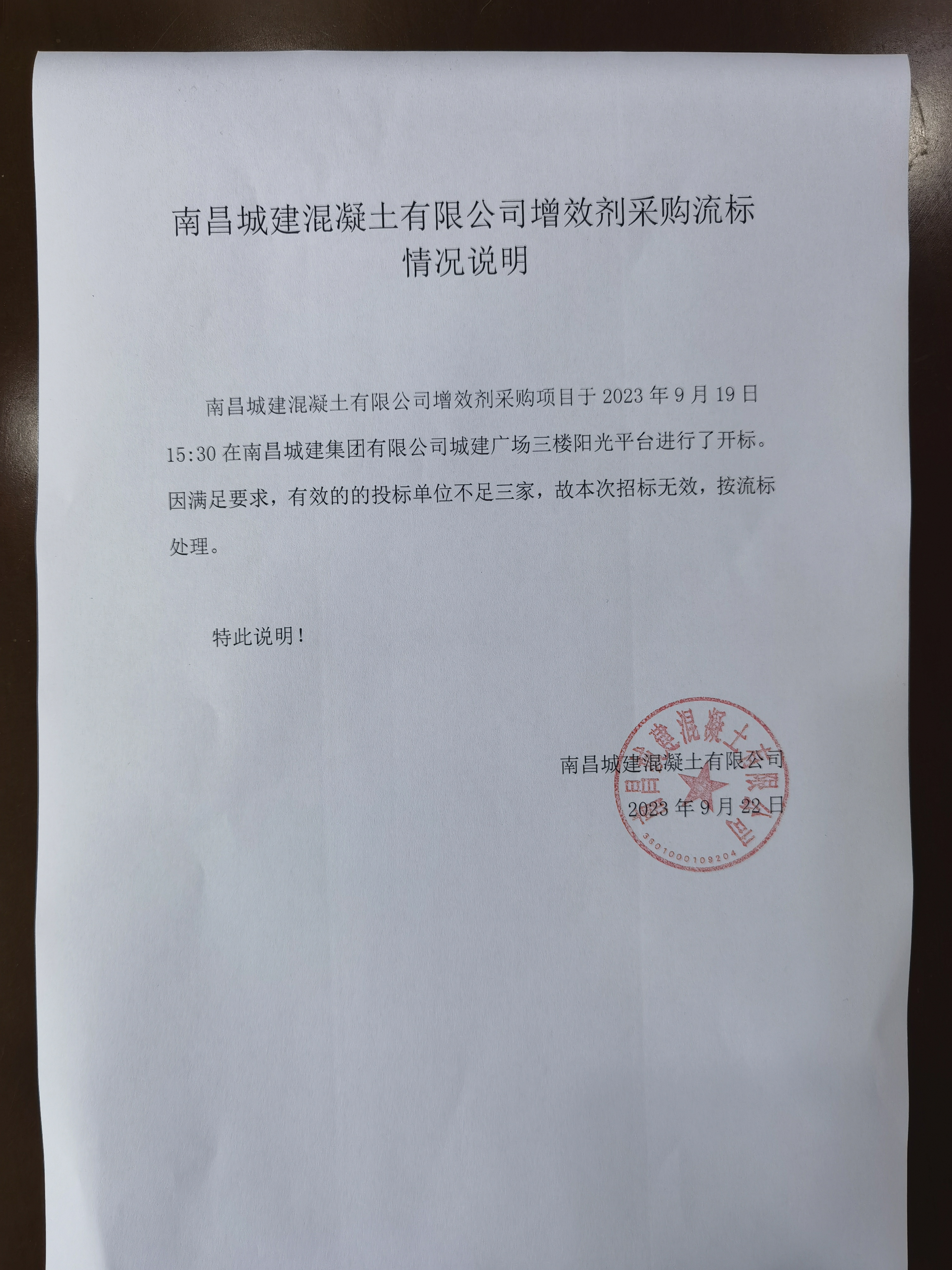 威廉体育混凝土有限公司增效剂采购项目于2023年9月19日15:30在威廉体育集团有限公司城建广场三楼阳光平台进行了开标。因满足要求,有效的的投标单位不足三家,故本次招标无效,按流标处理。