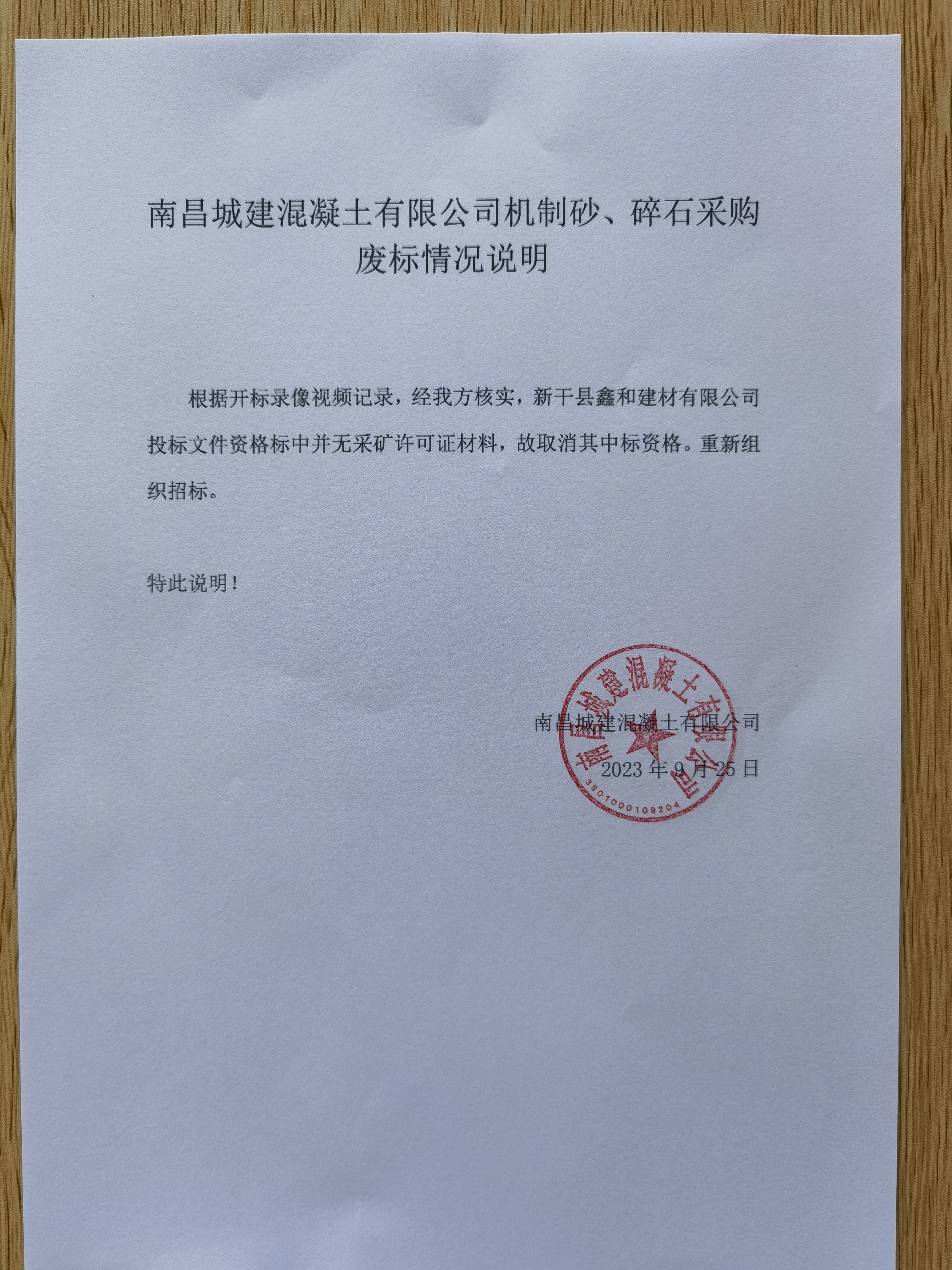 根据开标录像视频记录,经我方核实,新干县鑫和建材有限公司投标文件资格标中并无采矿许可证材料,故取消其中标资格。重新组织招标。