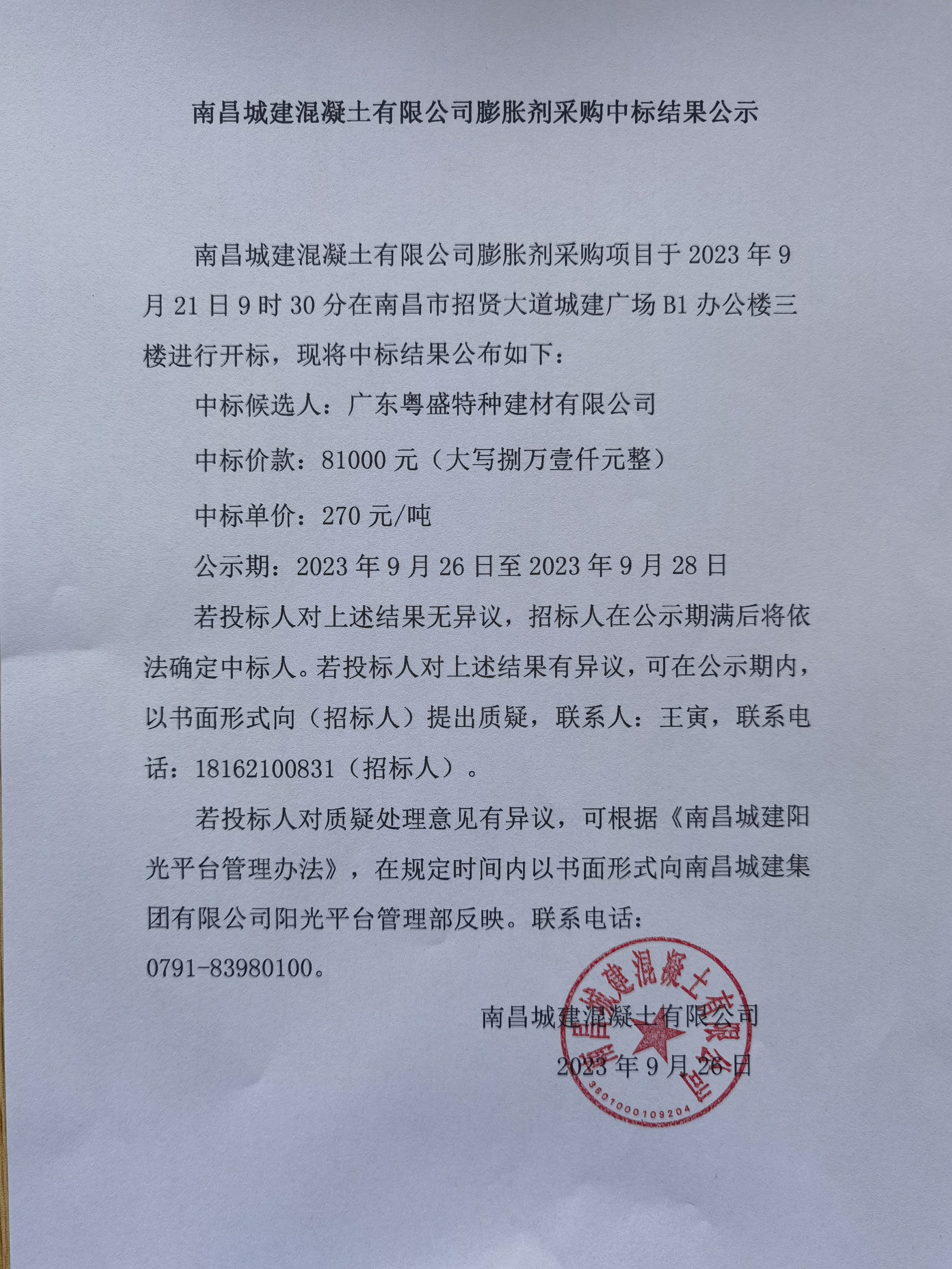 威廉体育混凝土有限公司膨胀剂采购项目于2023年9月21日9时30分在南昌市招贤大道城建广场B1办公楼三楼进行开标,现将中标结果公布如下: