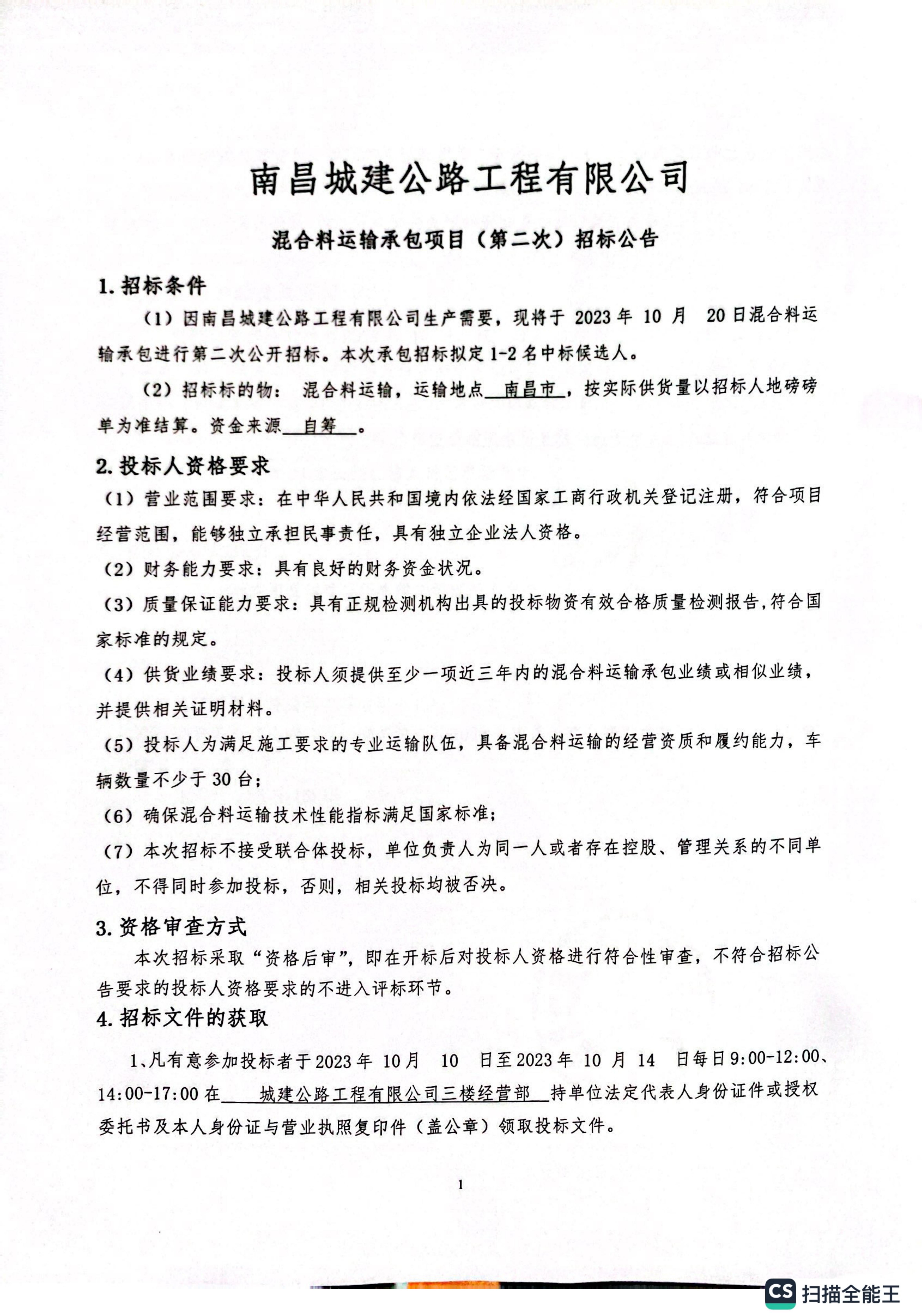 (1)因威廉体育公路工程有限公司生产需要,现将于 2023年 10 月 20日混合料运输承包进行第二次公开招标。本次承包招标拟定1-2名中标候选人。
